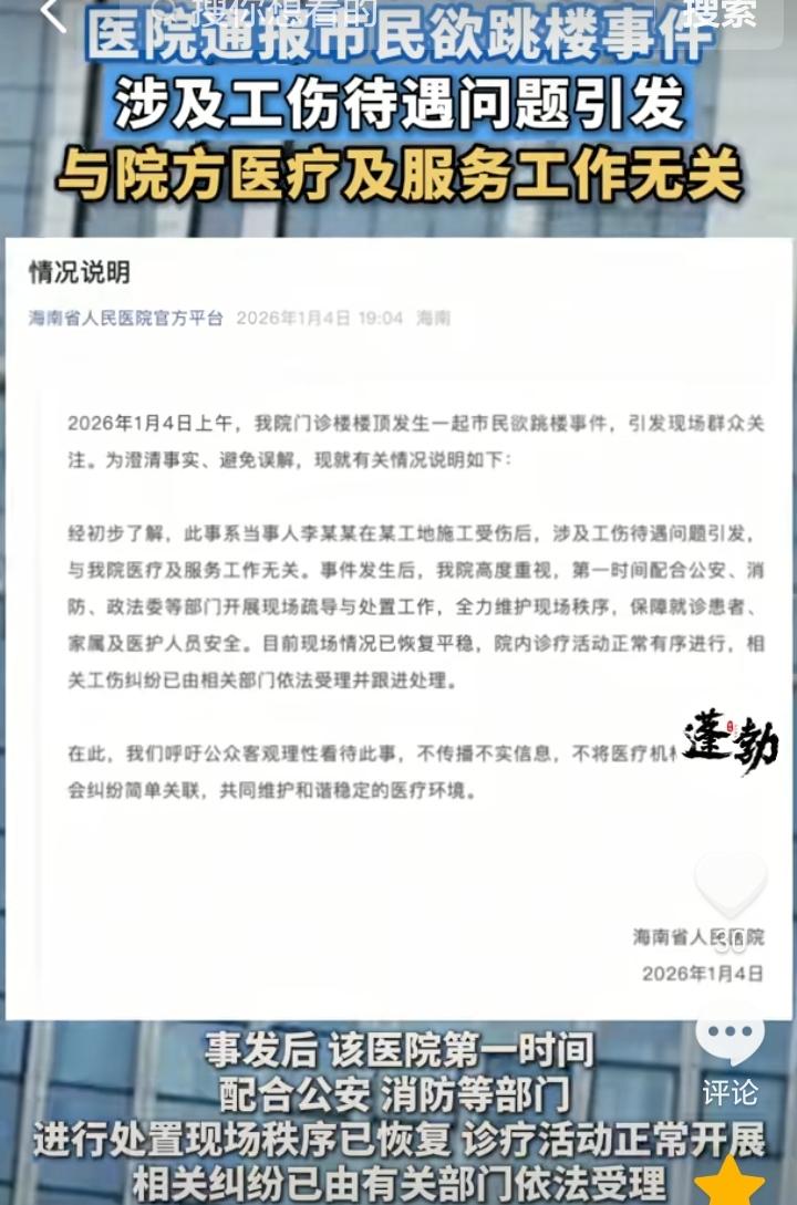 冲动了!海南海口,一市民上医院门诊楼顶欲跳楼,经过了解得知该市民并非是和医院有纠纷,而是该市民在工地受伤后因工伤待遇发生纠纷,事发后该医院也是第一时间配合有关部门处置现场秩序,相关纠纷已由有关部门依法受理。 既然是在工地受伤,那么工地就应该按照规定赔偿,可能男子也是一时冲动所以才会做傻事,不过男子也是,既然是和工地发生的纠纷,结果确是在医院欲跳楼,这样会对医院带来不必要的麻烦。 遇事不要冲动,既然对工伤待遇有纠纷,那就应该理解纠纷,如果解决不了完全可以找有关部门,没有必要去做傻事,生命只有一次,应该好好珍惜。