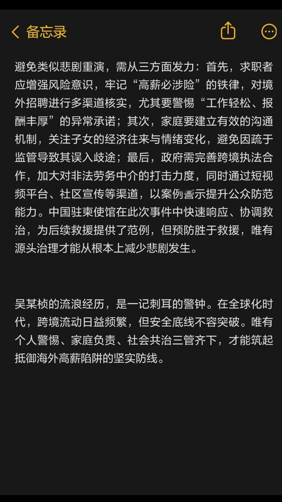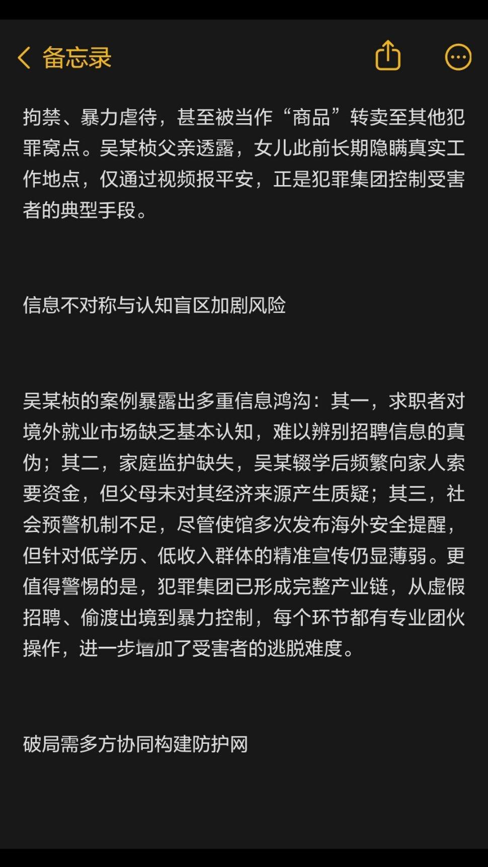 | 近日,福建籍20岁女网红吴某桢流落柬埔寨街头的新闻引发广泛关注。这起事件不仅是一个家庭的悲剧,更暴露出海外高薪陷阱的普遍性与危害性,值得深入反思。据中国驻柬埔寨大使馆通报,她因轻信“高薪工作”诱惑赴柬,最终流落街头、身体受损。这与近年来多起类似案件如出一辙:不法分子以“月入数万”“工作轻松”为饵,将求职者诱骗至境外,迫使其参与网络赌博、电信诈骗等违法活动。一旦受害人拒绝或试图逃离,便会遭遇非法拘禁、暴力虐待,甚至被当作“商品”转卖至其他犯罪窝点。吴某桢父亲透露,女儿此前长期隐瞒真实工作地点,仅通过视频报平安,正是犯罪集团控制受害者的典型手段。吴某桢的案例暴露出多重信息鸿沟:其一,求职者对境外就业市场缺乏基本认知,难以辨别招聘信息的真伪;其二,家庭监护缺失,吴某辍学后频繁向家人索要资金,但父母未对其经济来源产生质疑;其三,社会预警机制不足,尽管使馆多次发布海外安全提醒,但针对低学历、低收入群体的精准宣传仍显薄弱。更值得警惕的是,犯罪集团已形成完整产业链,从虚假招聘、偷渡出境到暴力控制,每个环节都有专业团伙操作,进一步增加了受害者的逃脱难度。避免类似悲剧重演,需从三方面发力:首先,求职者应增强风险意识,牢记“高薪必涉险”的铁律,对境外招聘进行多渠道核实,尤其要警惕“工作轻松、报酬丰厚”的异常承诺;其次,家庭要建立有效的沟通机制,关注子女的经济往来与情绪变化,避免因疏于监管导致其误入歧途;最后,政府需完善跨境执法合作,加大对非法劳务中介的打击力度,同时通过短视频平台、社区宣传等渠道,以案例警示提升公众防范能力。中国驻柬使馆在此次事件中快速响应、协调救治,为后续救援提供了范例,但预防胜于救援,唯有源头治理才能从根本上减少悲剧发生。吴某桢的流浪经历,是一记刺耳的警钟。在全球化时代,跨境流动日益频繁,但安全底线不容突破。唯有个人警惕、家庭负责、社会共治三管齐下,才能筑起抵御海外高薪陷阱的坚实防线。