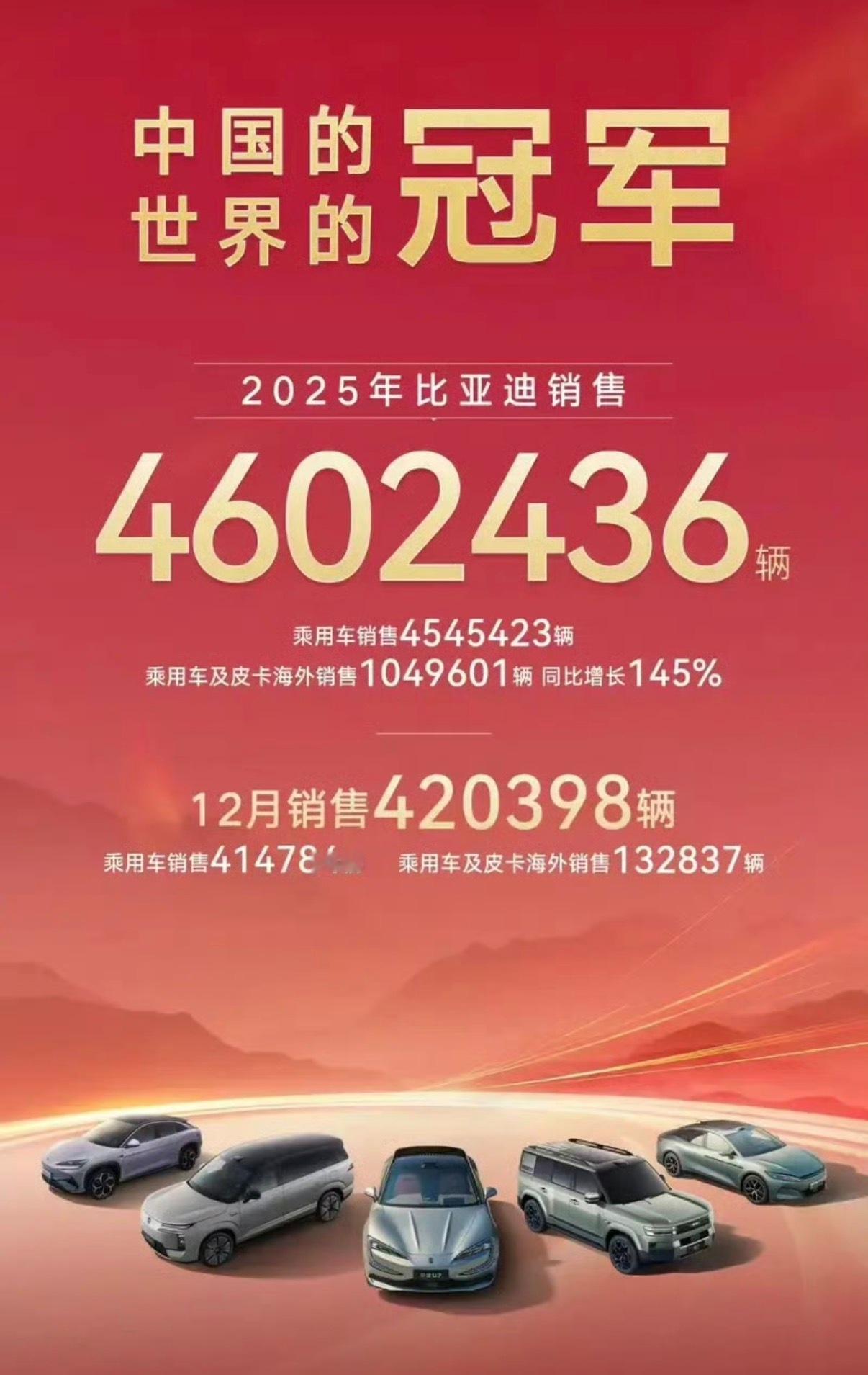 【比亚迪全年纯电动汽车销量首次超越特斯拉 跃居全球第一】据国内媒体报道,比亚迪首次在全年纯电动汽车销量上超越特斯拉,跃居全球第一。数据显示,比亚迪2025年销量为4602436辆,其中纯电车型销量约为226万辆。特斯拉公布的数据显示,2025年累计交付163.61万辆,这是比亚迪在全年纯电动汽车销量上首次超越特斯拉。1月1日,比亚迪汽车公布最新销量数据。2025年,比亚迪全年销售4602436辆。其中,乘用车销售4545423辆。乘用车及皮卡海外销售1049601辆,同比增长145%。