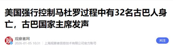 特朗普:32名马杜罗的古巴保镖在抓捕行动中被击毙特朗普周日在“空军一号”专机上透露,在抓捕马杜罗时,大量马总统的古巴保镖丧生,共有32人,“你们知道,昨天有许多古巴人丧生,不幸的是,对方阵营死伤惨重,他们当时正在保护马杜罗,这绝非明智之举。” 这哪是什么 “抓捕行动” 啊,明明就是一场早有预谋的国家恐怖主义做法。 美国这次动手一点都不突然,这事早从 2025 年 8 月就有苗头了。中情局偷偷往委内瑞拉派了秘密行动队,一边靠内部线人打探马杜罗的生活规律、行踪路线,一边用隐形无人机全天候盯着他。 马杜罗的饮食习惯、出行偏好,甚至养的宠物,他们都摸得一清二楚。之后美国就一步步升级施压,8 月的时候悬赏 5000 万美元缉拿马杜罗,12 月又全面封锁委内瑞拉的油轮,还把马杜罗政府列为 “外国恐怖组织”。 他们嘴上喊着 “打击贩毒”,其实眼里就盯着委内瑞拉的石油资源。特朗普后来直接说,要让美国的大型石油公司进委内瑞拉,修修设施赚钱,这话算是把侵略的真实目的说漏了。 1 月 3 日凌晨的行动更暴露了美国的霸道,特朗普一声令下,150 多架飞机从 20 个基地起飞。这些飞机贴着海面 30 米低空飞,就是为了躲避雷达,先把委内瑞拉的防空系统砸毁了,再直奔马杜罗的住所。 这些古巴保镖心里清楚,面对的是世界上最强大的军事力量,但还是毫不犹豫地投入战斗。他们用血肉之躯筑起防线,最后 32 人全牺牲了。 古巴政府随后证实了这个噩耗,还宣布全国哀悼,哈瓦那街头很快聚集了上万民众抗议,大家高呼支持委内瑞拉的口号。可特朗普却轻描淡写地说 “这绝非明智之举”,这种冷血的话背后,是对他国主权和生命的彻底不在乎。 美军这次行动看着 “精准”,其实漏洞一大堆。他们虽然靠着情报优势抓了马杜罗夫妇,还把他们用直升机运到军舰上,再转去纽约受审,但行动中一架直升机被打得伤痕累累。 委内瑞拉全国马上进入紧急状态,副总统罗德里格斯公开要求美国提供马杜罗活着的证据,境内的军民也在一直抵抗。 更讽刺的是,美国之前还想策反马杜罗的首席飞行员,用重金和家人安全威逼利诱,结果被对方严词拒绝。这次只能靠武力硬闯,这也能看出来,马杜罗政权根本不是美国说的那样 “不得人心”。 那些古巴保镖之所以牺牲,就是因为他们看清了美国侵略的本质,宁愿死也不妥协。 国际社会的反应更是戳破了美国的谎言。哥伦比亚总统第一时间发了警报,说委内瑞拉正遭导弹轰炸。古巴国家主席痛斥这是 “国家恐怖主义行径”,俄罗斯也谴责美国违反国际法。 就连美国国内,不少城市都爆发了抗议集会。特朗普嘴上说 “委内瑞拉所有军事力量都已丧失战斗力”,还威胁要发动第二波打击,但实际上美军根本不敢贸然派大量地面部队。 他们只能靠 “管理” 委内瑞拉过渡来稳住局势,可拉美国家早就看透了美国的套路。从之前的古巴导弹危机到现在的委内瑞拉局势,美国从来都是靠武力干涉他国内政,掠夺资源,却还美其名曰 “维护正义”。 这 32 名古巴保镖的牺牲,不光是古巴和委内瑞拉的损失,更是对国际秩序的践踏。美国以为靠强大的军事力量就能随心所欲抓捕一个主权国家的总统,就能轻易掌控他国的石油资源,却忘了越是高压打压,反抗就越是坚决。 古巴民众在集会上喊出 “做好准备捍卫国家和主权”,委内瑞拉政府也明确表示 “掠夺资源的企图不会得逞”。这些声音都在告诉美国,霸权主义早就行不通了。 特朗普或许还在为所谓的 “军事胜利” 沾沾自喜,但他没意识到,这场行动只会让拉美国家更加团结,让更多人看清美国的侵略本质。 接下来美国想要顺利掌控委内瑞拉,恐怕没那么容易,毕竟主权从来不是靠武力就能夺走的。而那些为捍卫主权牺牲的古巴保镖,也会被永远铭记,他们的牺牲不是 “不明智”,而是最壮烈的正义之举。