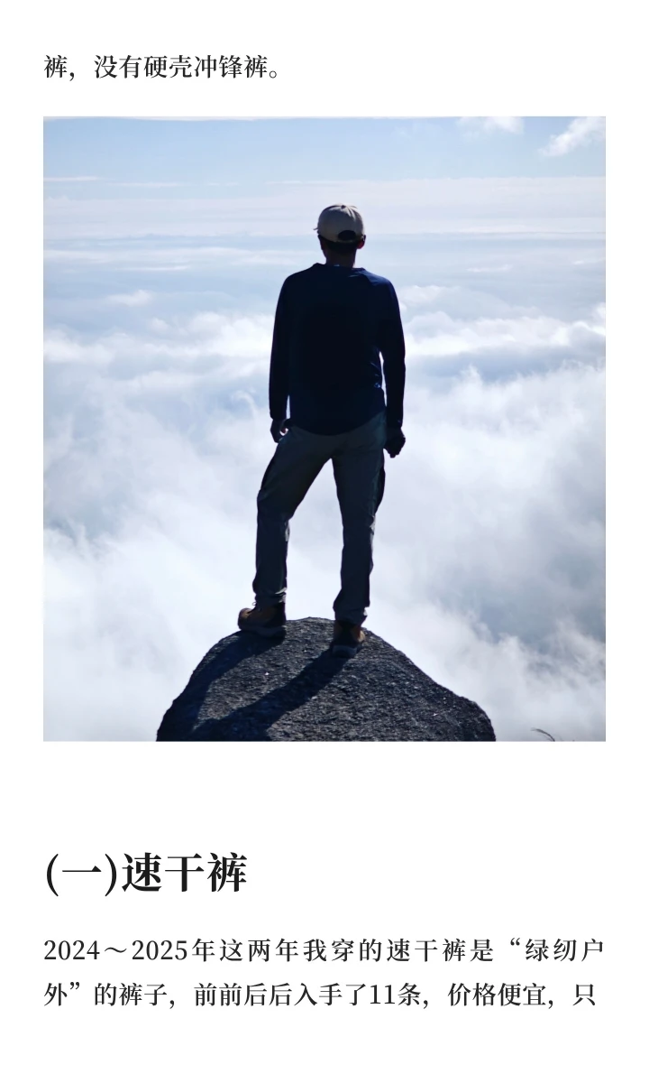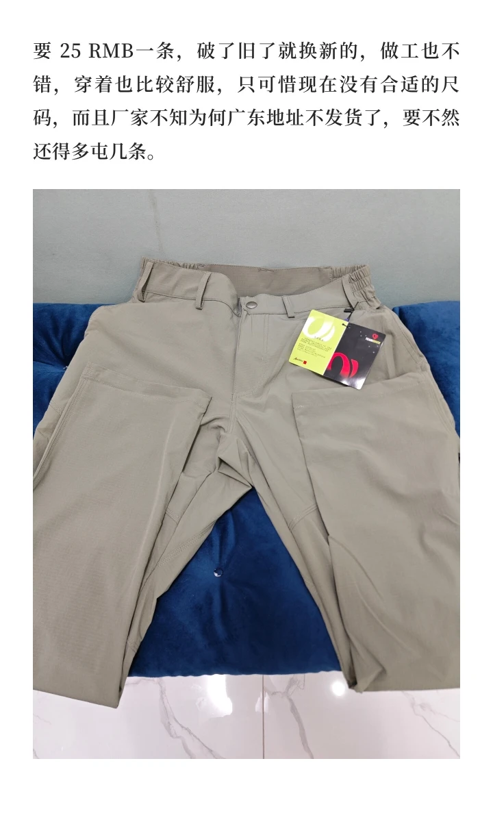 2024~2025年这两年我穿的速干裤是“绿纫户外”的裤子,前前后后入手了11条,价格便宜,只要 25 RMB一条,破了旧了就换新的,做工也不错,穿着也比较舒服,只可惜现在没有合适的尺码,而且厂家不知为何广东地址不发货了,要不然还得多屯几条。