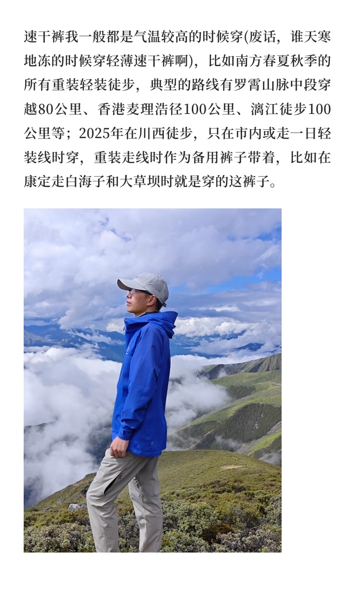 速干裤我一般都是气温较高的时候穿(废话,谁天寒地冻的时候穿轻薄速干裤啊),比如南方春夏秋季的所有重装轻装徒步,典型的路线有罗霄山脉中段穿越80公里、香港麦理浩径100公里、漓江徒步100公里等;2025年在川西徒步,只在市内或走一日轻装线时穿,重装走线时作为备用裤子带着,比如在康定走白海子和大草坝时就是穿的这裤子。