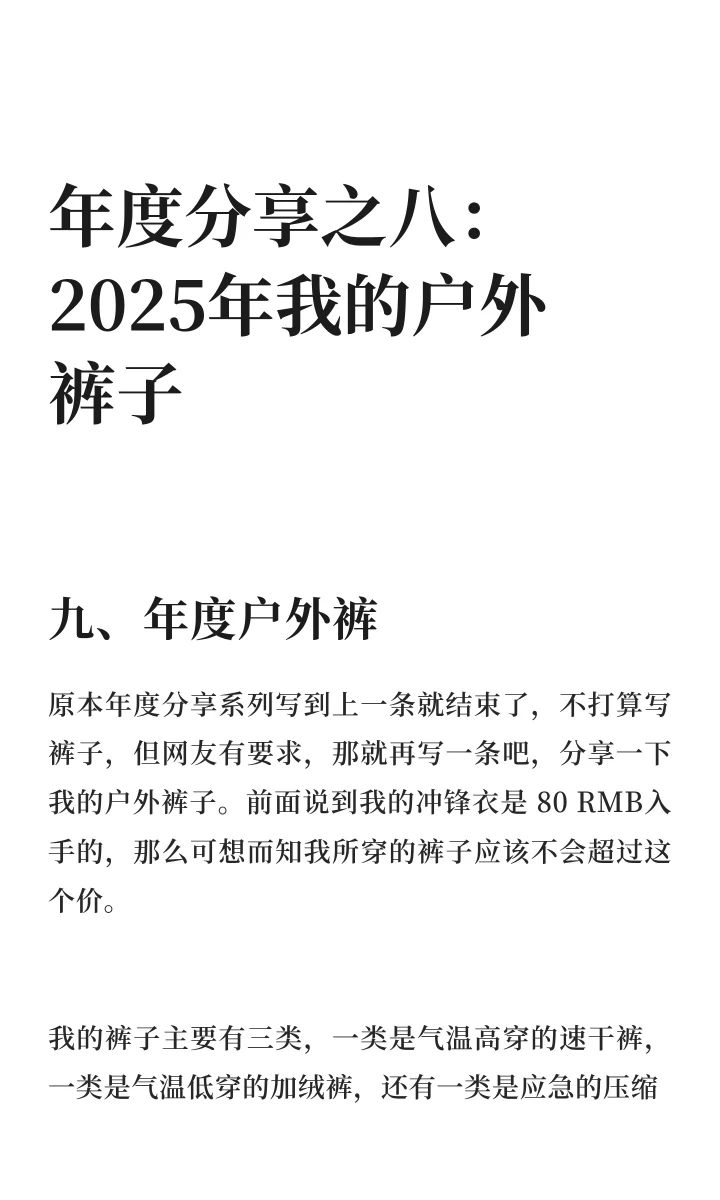 原本年度分享系列写到上一条就结束了,不打算写裤子,但网友有要求,那就再写一条吧,分享一下我的户外裤子。前面说到我的冲锋衣是 80 RMB入手的,那么可想而知我所穿的裤子应该不会超过这个价。