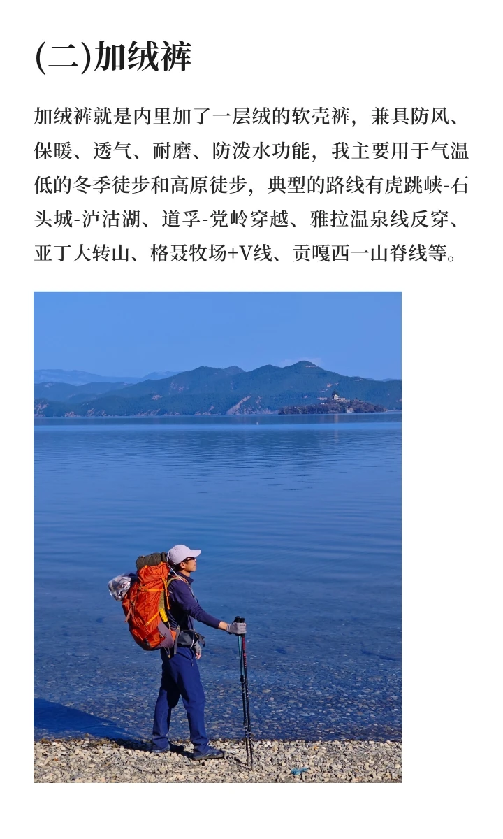 加绒裤就是所谓的软壳裤,内里加了一层绒,兼具防风、保暖、透气、耐磨、防刮、防泼水功能,我主要用于气温低的冬季徒步和高原徒步,典型的路线有虎跳峡-石头城-泸沽湖、道孚-党岭穿越、雅拉温泉线反穿、亚丁大转山、格聂牧场+V线、贡嘎西一山脊线等。