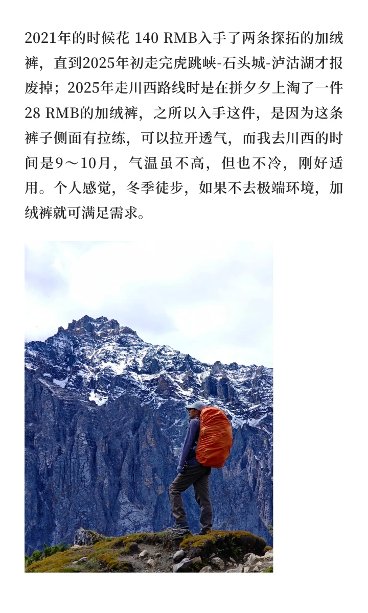 2021年的时候花 140 RMB入手了两条探拓的加绒裤,直到2025年初走完虎跳峡-石头城-泸沽湖才报废掉;2025年走川西路线时是在拼夕夕上淘了一件 28 RMB的加绒裤,之所以入手这件,是因为这条裤子侧面有拉练,可以拉开透气,而我去川西的时间是9~10月,气温虽不高,但也不冷,刚好适用。个人感觉,冬季徒步,如果不去极端环境,加绒裤就可满足需求,平常过冬也可以穿。