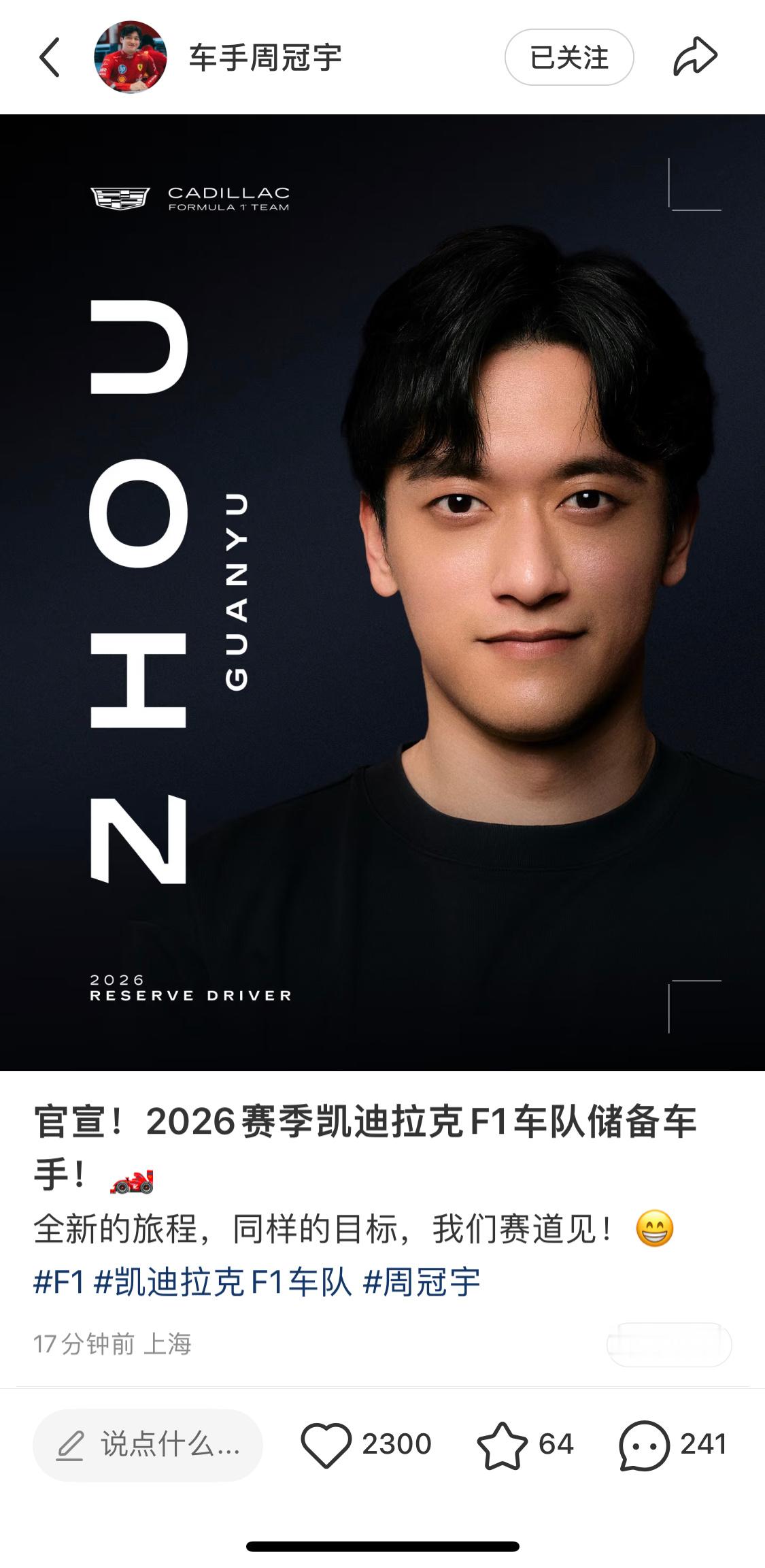 周冠宇加盟凯迪拉克恭喜周哥!!!2026围场继续见!!!🐱周冠宇成为凯迪拉克储
