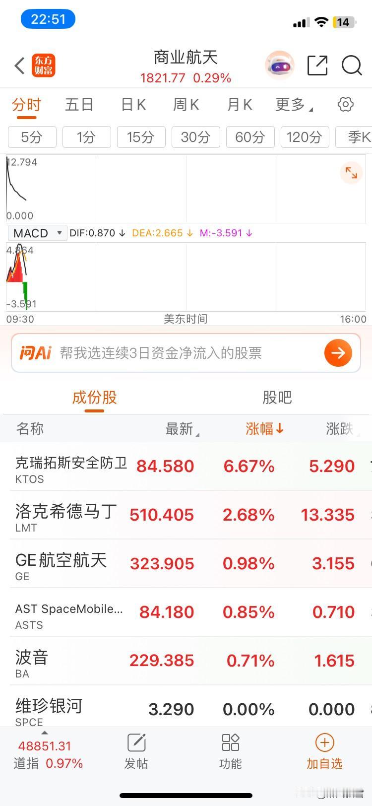 美市开盘,2026年首秀高开高走 北京时间22:53分数据,明天早上再观察:美三指数收盘收阳,龙指数收阴。 一、大A明天冲高回落概率加大! 二、美股三大指数高开后集体收涨,道指涨0.98%、标普500涨0.55%、纳指涨0.68%,炼油、数字货币、核电板块领涨。纳斯达克中国金龙指数高开低走,与美股大盘走势分化,整体表现弱于美股。 三、美市场商业航天目前收小阳!