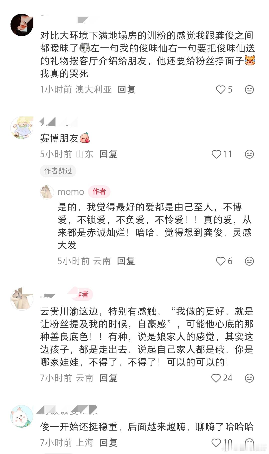 xhs有高赞夸龚俊昨天的直播:很真诚,双方唠嗑,粉丝和偶像的剧里不太远不太近,刚刚好,娘家人的感觉。甚至龚俊还说要让粉丝喜欢自己不丢人