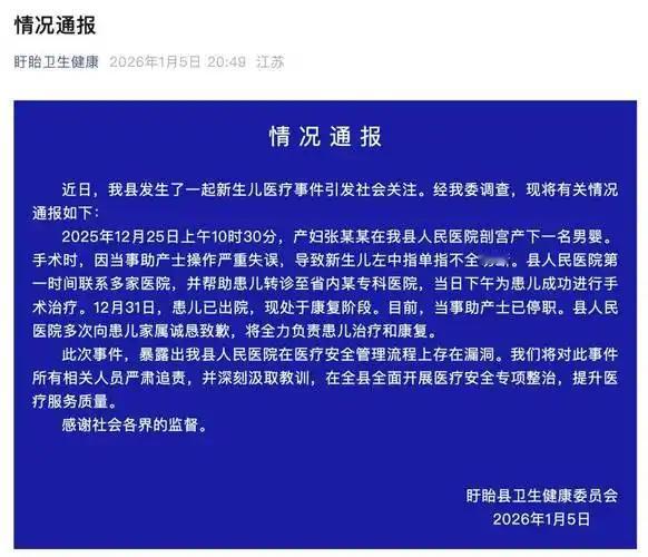 1月5日,盱眙县卫生健康委员会针对一新生儿剪脐带时被剪断手指发布情况通报。通报称患儿完成手术并出院,现处于康复阶段。目前,当事助产士已被停职,医院向家属致歉并承诺承担治疗康复责任。 在这个看似普通的医疗事件背后,折射出的是我们对生命细节的忽视,还是制度执行的漏洞?一名新生儿在刚刚开始生命的第一天,竟然遭遇了如此令人心碎的意外——脐带被剪断时,手指竟然被误伤。这一幕,令人震惊,也令人深思。 事件发生后,医院迅速做出反应,通报中提到患儿已完成手术并出院,处于康复阶段。表面看似平静,但谁能忽视这个看似“小事故”背后,隐藏着多大的责任与反思?一名助产士的失误,竟然让一个新生命遭受了如此的痛苦。停职处理固然是必要的,但更重要的是,我们是否真正反思了医院的管理体系、培训机制是否到位?是否每一个环节都能做到细致入微、责任到人? 这个事件也让我们看到,生命的脆弱与宝贵。一个小小的失误,可能带来无法估量的后果。我们常说“生命无价”,但在实际操作中,似乎“细节决定成败”。医院的每一项操作都应像对待自己的生命一样严谨,每一次剪刀的落下都应充满敬畏。否则,任何一丝疏忽都可能成为无法弥补的遗憾。 更令人关注的是,公众的反应与医院的应对态度。家属的心情可以想象,面对孩子的伤痛,他们的焦虑与愤怒。医院的道歉和承诺固然重要,但能否从根本上杜绝类似事件再次发生?这不仅是对患者的责任,更是对每一位新生命的尊重。 这个事件也引发了社会的广泛讨论:我们是否还在某些环节掉以轻心?医疗安全究竟有多坚固?我们期待的不仅仅是“善后”,更是制度的完善、责任的落实。每一位医护人员都应成为生命的守护者,而不是事故的制造者。 或许,这个小小的事件能唤醒我们对生命的敬畏与责任。每一个细节都值得我们反复琢磨,每一次操作都应带着敬畏之心。毕竟,生命只有一次,没有重来的机会。让我们共同期待,医院能从中吸取教训,真正做到以患者为中心,守护每一份生命的纯真与希望。
