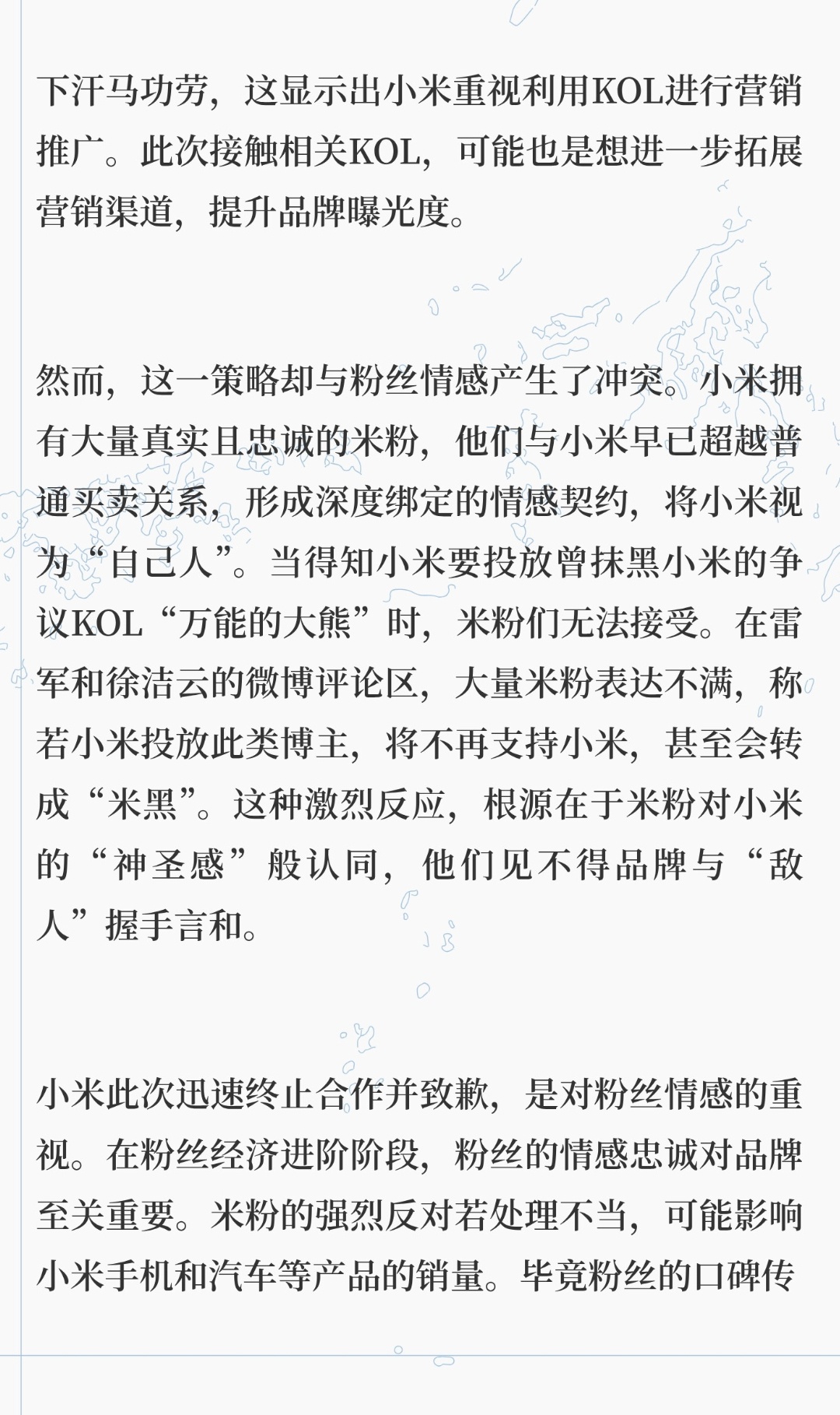 | 2026年1月5日,小米新任公关部总经理徐洁云发文致歉,宣布立即终止与相关KOL可能进行的任何形式合作,且以后也不会再合作。这一事件背后,是粉丝情感与品牌策略的碰撞。在竞争激烈的科技市场,拉拢更多KOL为自己说话,能扩大品牌影响力,多一个朋友就少一个“敌人”。比如此前小米高管全员化身KOL活跃于社交媒体,王腾凭借自身能力为小米品牌传播立下汗马功劳,这显示出小米重视利用KOL进行营销推广。此次接触相关KOL,可能也是想进一步拓展营销渠道,提升品牌曝光度。小米拥有大量真实且忠诚的米粉,他们与小米早已超越普通买卖关系,形成深度绑定的情感契约,将小米视为“自己人”。当得知小米要投放曾抹黑小米的争议KOL“万能的大熊”时,米粉们无法接受。在雷军和徐洁云的微博评论区,大量米粉表达不满,称若小米投放此类博主,将不再支持小米,甚至会转成“米黑”。这种激烈反应,根源在于米粉对小米的“神圣感”般认同,他们见不得品牌与“敌人”握手言和。小米此次迅速终止合作并致歉,是对粉丝情感的重视。在粉丝经济进阶阶段,粉丝的情感忠诚对品牌至关重要。米粉的强烈反对若处理不当,可能影响小米手机和汽车等产品的销量。毕竟粉丝的口碑传播和购买支持,对品牌发展有着不可忽视的作用。品牌在追求更广泛传播和合作时,需兼顾核心粉丝的情感契约。小米未来在筛选投放KOL时,或许要更加谨慎,充分评估可能引发的粉丝反应,平衡好品牌策略与粉丝情感之间的关系,才能在市场竞争中稳步前行。