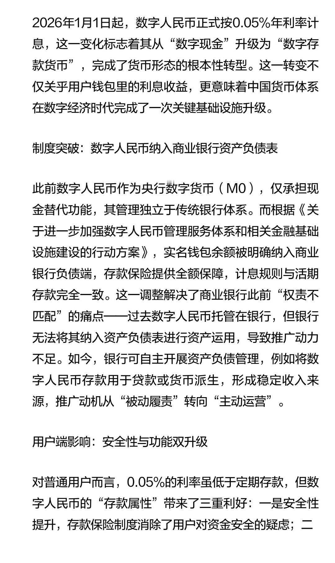 | 2026年1月1日起,数字人民币正式按0.05%年利率计息,这一变化标志着其从“数字现金”升级为“数字存款货币”,完成了货币形态的根本性转型。这一转变不仅关乎用户钱包里的利息收益,更意味着中国货币体系在数字经济时代完成了一次关键基础设施升级。此前数字人民币作为央行数字货币(M0),仅承担现金替代功能,其管理独立于传统银行体系。而根据《关于进一步加强数字人民币管理服务体系和相关金融基础设施建设的行动方案》,实名钱包余额被明确纳入商业银行负债端,存款保险提供全额保障,计息规则与活期存款完全一致。这一调整解决了商业银行此前“权责不匹配”的痛点——过去数字人民币托管在银行,但银行无法将其纳入资产负债表进行资产运用,导致推广动力不足。如今,银行可自主开展资产负债管理,例如将数字人民币存款用于贷款或货币派生,形成稳定收入来源,推广动机从“被动履责”转向“主动运营”。对普通用户而言,0.05%的利率虽低于定期存款,但数字人民币的“存款属性”带来了三重利好:一是安全性提升,存款保险制度消除了用户对资金安全的疑虑;二是流动性优势,数字人民币可实时转账、支付,同时享受利息收益;三是功能扩展空间,未来用户或可直接用数字人民币购买理财产品,实现“支付+储蓄+投资”一体化。例如,企业可通过数字人民币钱包管理供应链资金,政府可利用智能合约实现财政资金精准发放,跨境支付场景中多边央行数字货币桥(mBridge)已验证其高效性。数字人民币的存款属性使其成为央行可直接调控的政策变量。通过调整利率,央行可引导资金流向特定领域,例如对小微企业贷款提供利率补贴,或通过智能合约实现结构性货币政策。其交易可追溯性更可防范资金空转,提升政策传导效率。这一变革使中国在全球数字货币竞争中占据先机,为人民币国际化提供了数字化基础设施支撑。数字人民币的利息化不是简单的“存款化”,而是货币体系适应数字经济的必然选择。当数字人民币从“用完即走”的支付工具转变为可储蓄、可投资、可调控的数字货币,其背后是金融基础设施的全面升级,更是中国在全球货币竞争中的关键落子。