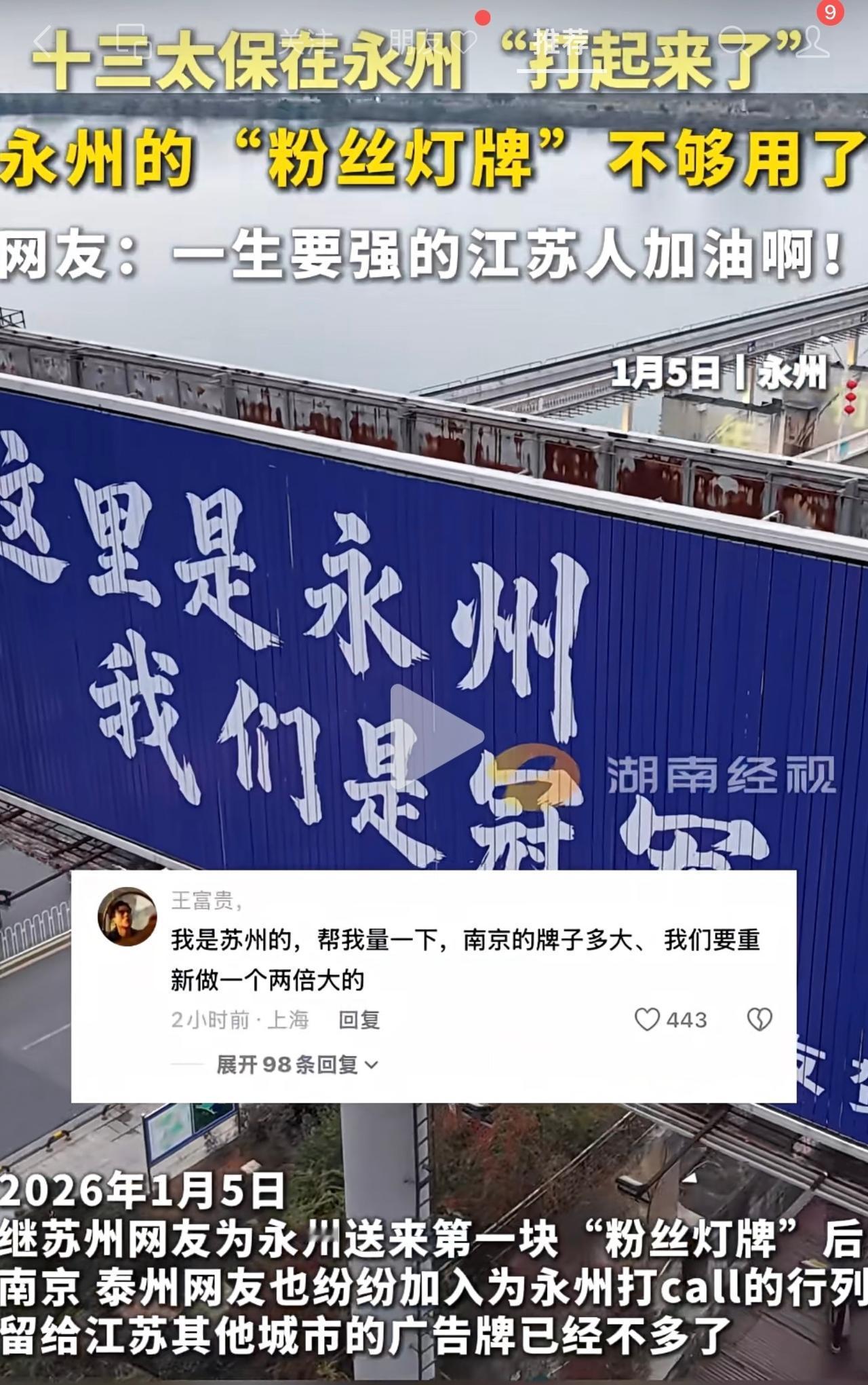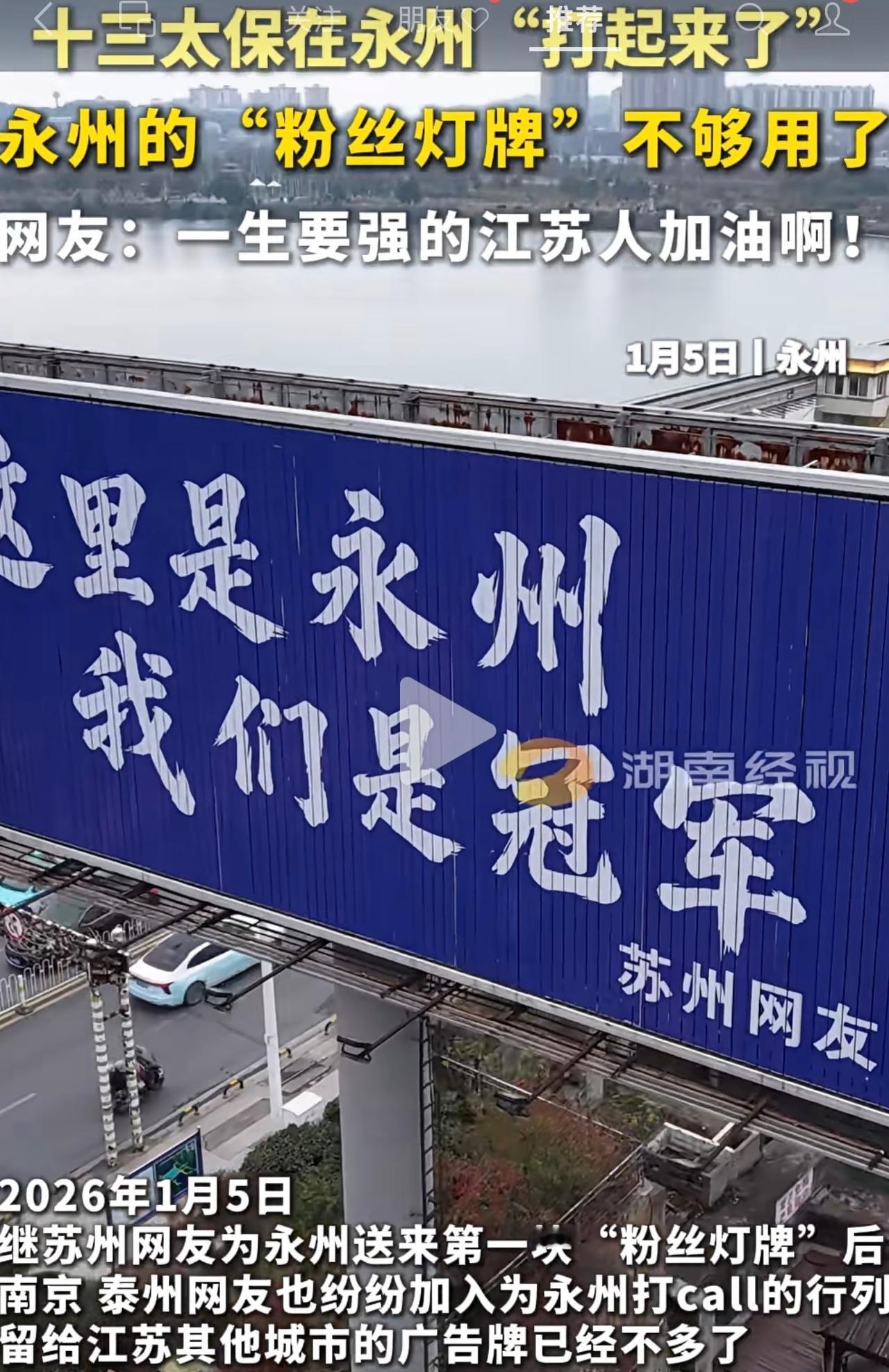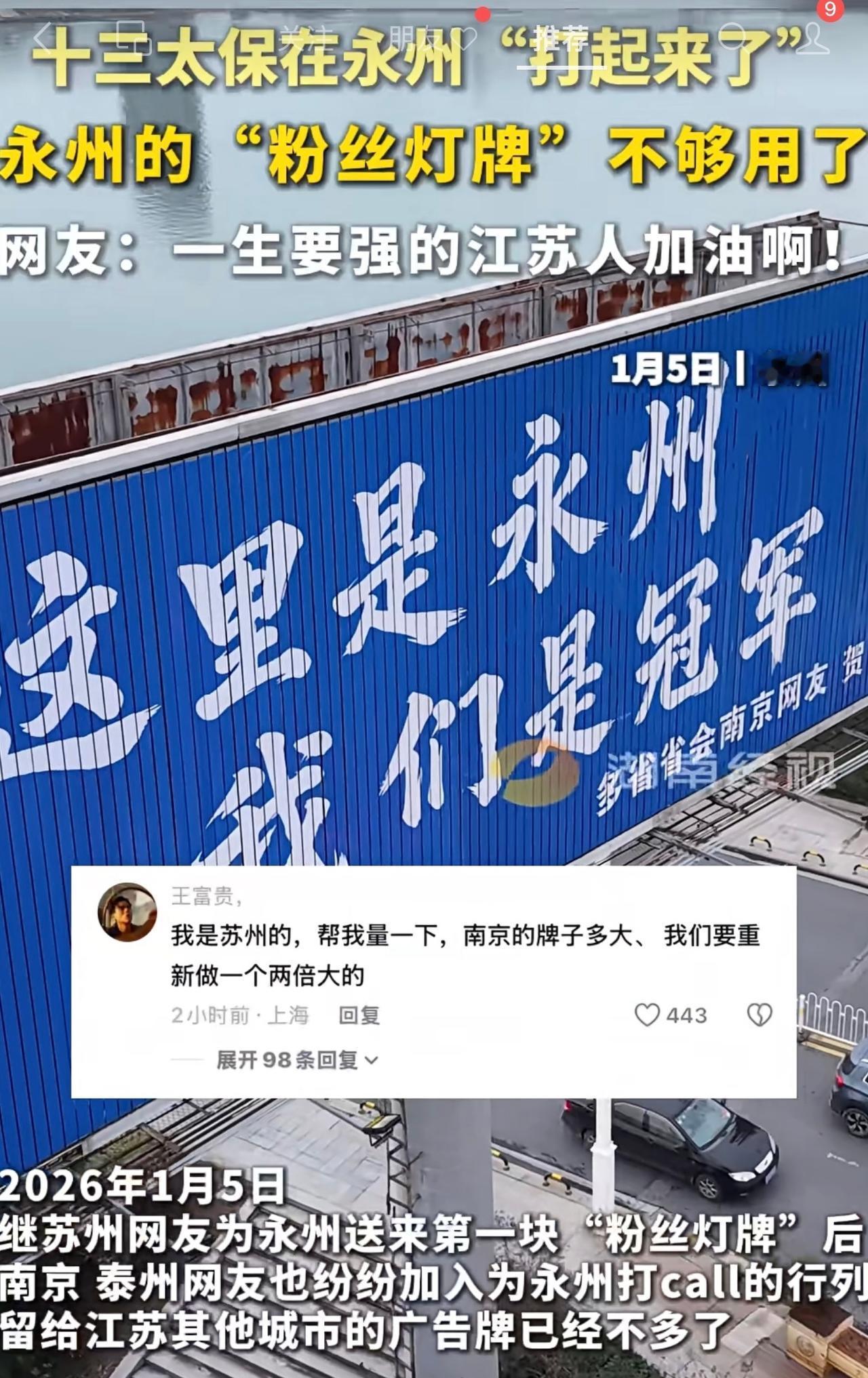 江苏十三太保也太有趣了吧,早几天苏州网友贺的广告牌刚出圈。今天南京网友迫不及待了,在大桥的对面又搞了个更显眼的牌子→多省省会南京网友贺[灵光一闪]