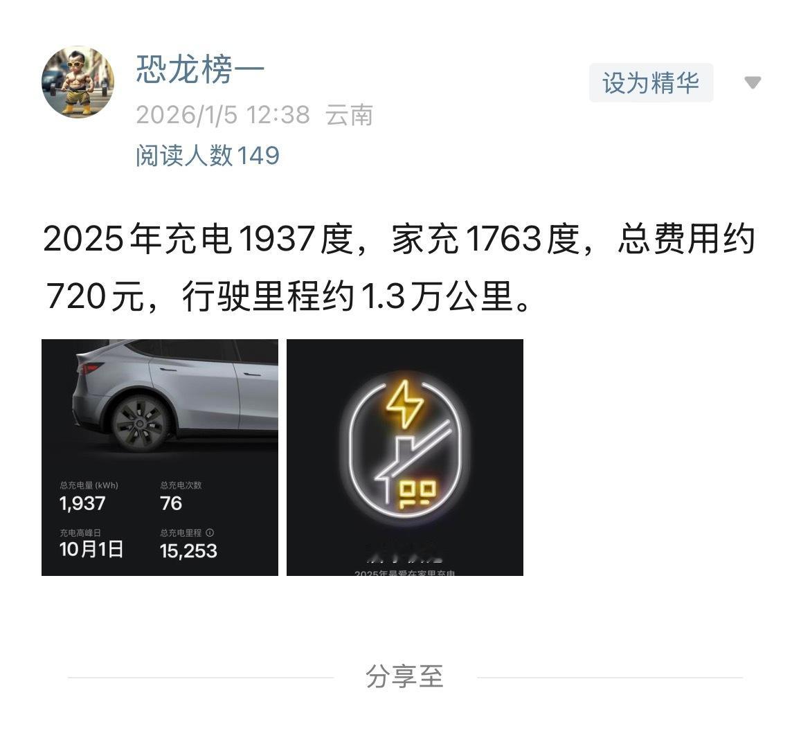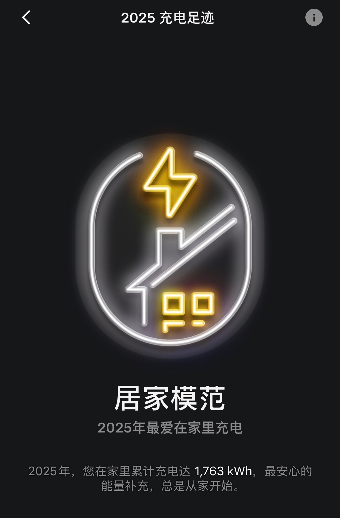 粉丝投稿:2025年充电1937度(其中家充1763度)总费用约720元,行驶里程约1.3万公里。不用每次加油几百几百的往外掏,这种感觉真的爽啊。
