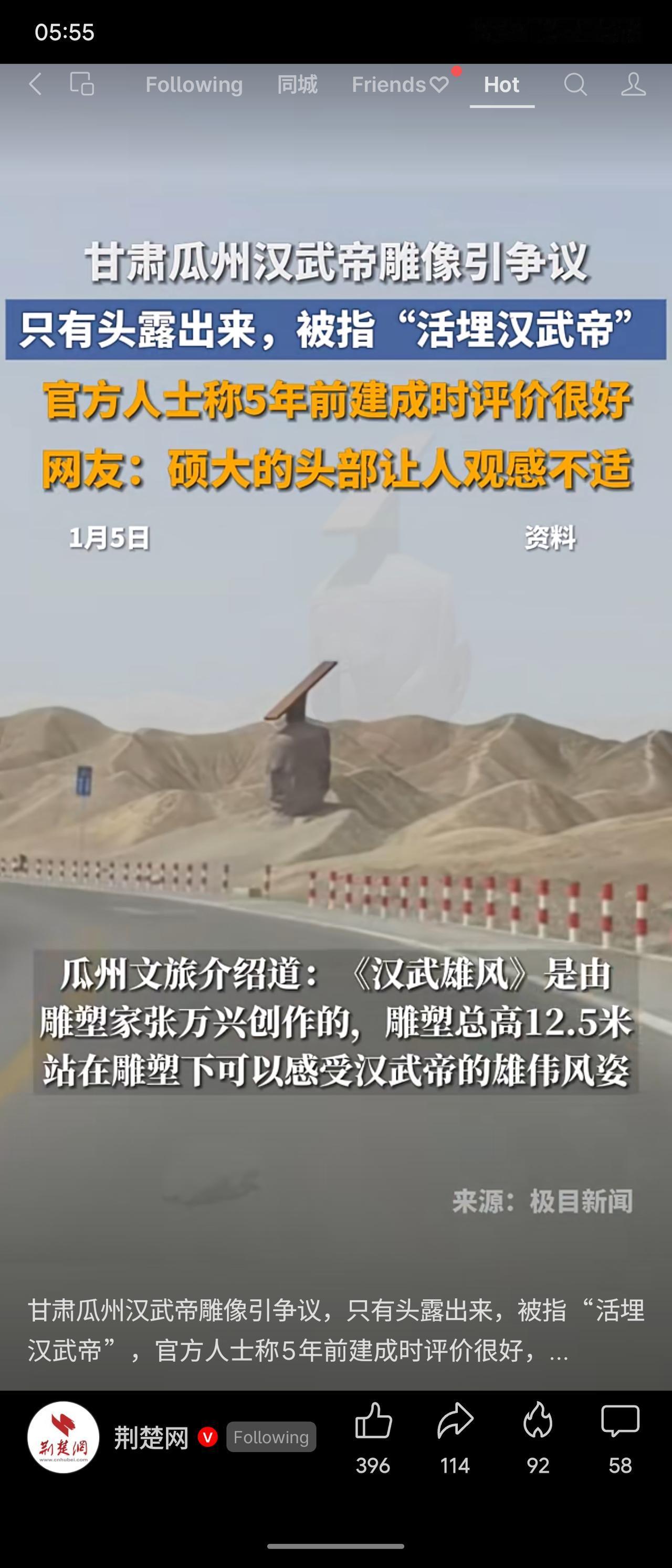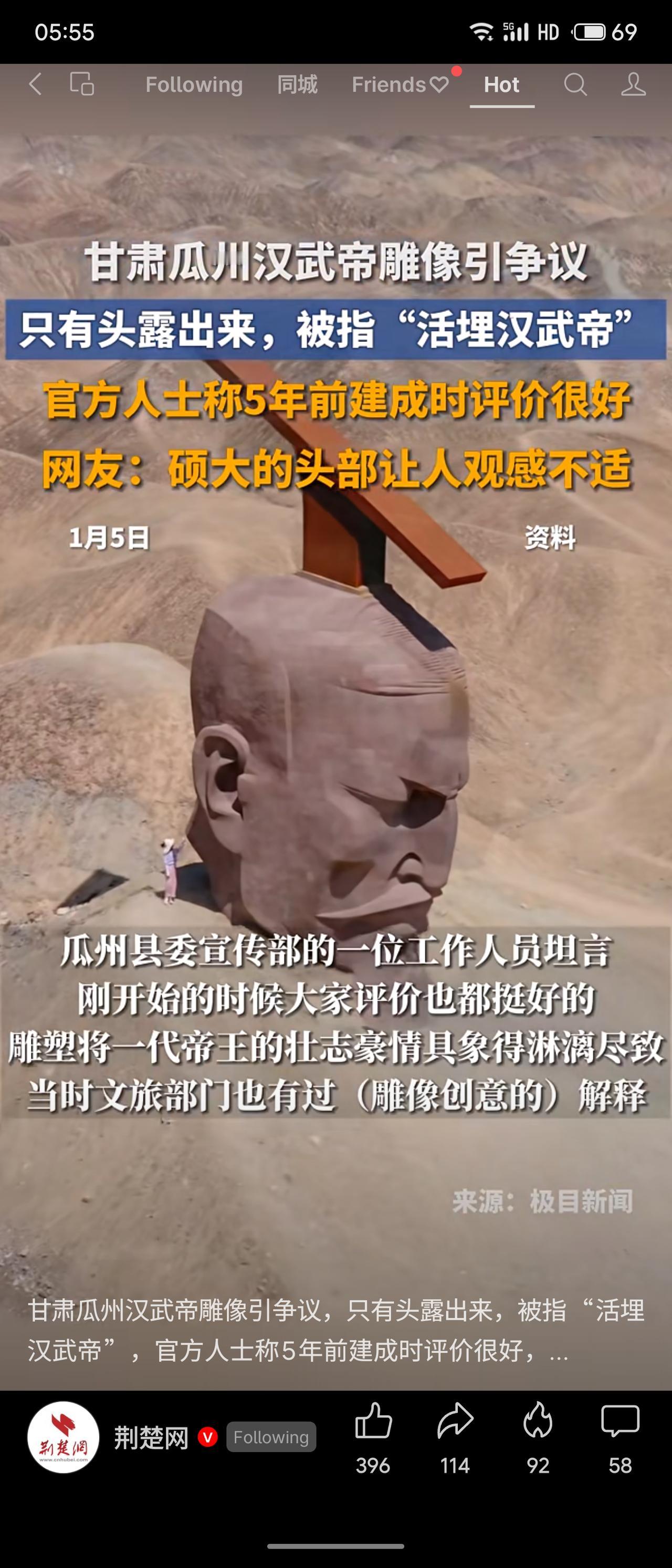 甘肃瓜州一尊仅露出头部的汉武帝雕像近日引发争议,被网友戏称为“活埋汉武帝”,认为其硕大头颅的造型令人不适。官方回应称,该雕像五年前落成时评价良好,高12.5米,旨在展现汉武帝的雄伟风姿。