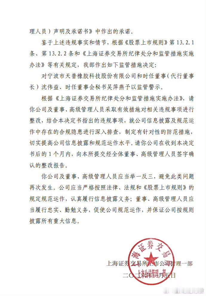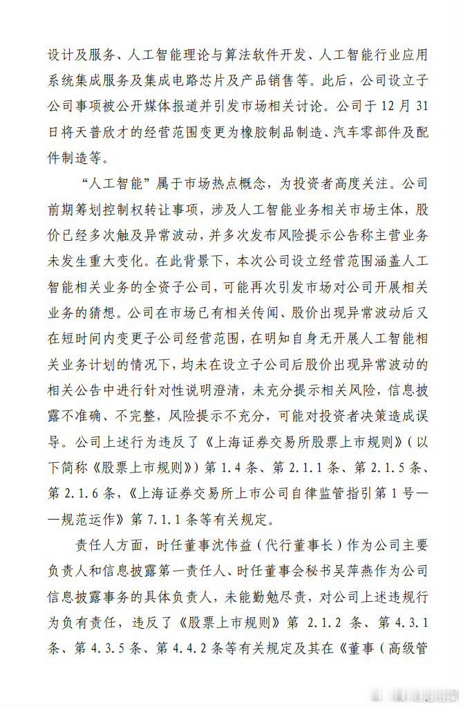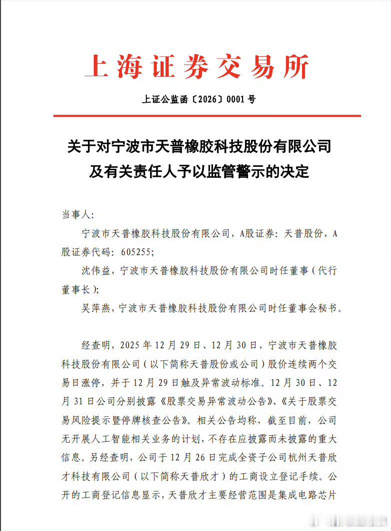 天普股份“踩雷”信息披露,背后藏着啥隐情?近日,上海证券交易所一纸监管警示决定,将宁波市天普橡胶科技股份有限公司(天普股份,证券代码:605255)推到风口浪尖,公司及时任董事沈伟益(代行董事长)、时任董事会秘书吴萍燕均被予以监管警示,这究竟是怎么回事?原来,天普股份在设立及变更子公司经营范围时,信息披露出了大问题。2025年12月26日,公司完成全资子公司杭州天普欣才科技有限公司的工商设立登记,其经营范围包含“人工智能理论与算法软件开发”等热点概念。可12月29日、30日股价连续涨停并异常波动后,公司公告却称“无开展人工智能业务计划,无应披露重大信息”,对子公司设立及经营范围只字不提。直到12月31日,才变更经营范围并发布风险提示公告。上交所指出,“人工智能”是投资者高度关注的热点。天普股份此前就因筹划相关业务主体控制权转让,股价多次异常波动。此时设立含人工智能业务的子公司,极易引发市场猜想。但公司在市场有传闻、股价异常波动后,公告中未针对性说明情况,短时间内又变更经营范围,且明知无计划却未充分提示风险,违反了相关规定。责任认定上,时任董事沈伟益作为主要负责人和信息披露第一责任人,时任董事会秘书吴萍燕作为具体负责人,均未能勤勉尽责,对违规行为负有责任。根据监管决定,天普股份及相关责任人需在收到决定书后1个月内,提交全体董事、高级管理人员签字确认的整改报告,排查信息披露及规范运作中的合规隐患并制定防范措施。此次事件也为其他上市公司敲响了信息披露合规的警钟。上交所对天普股份予以监管警示