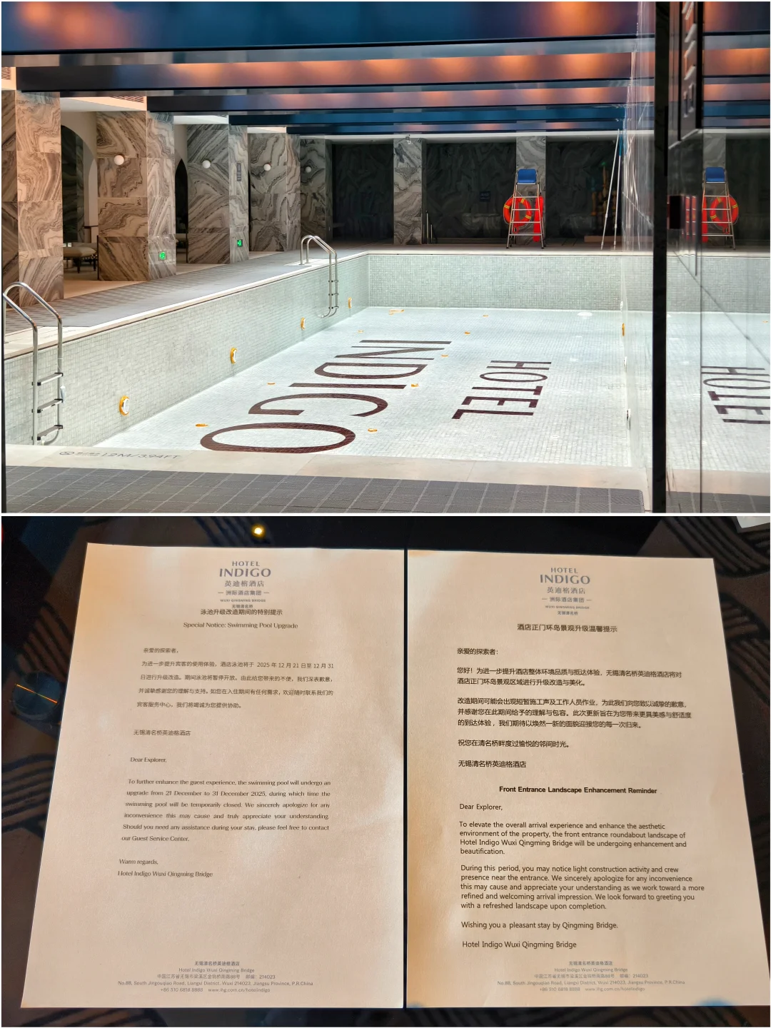 🔥无锡清名桥英迪格酒店,位于无锡市梁溪区金钩桥南路88号,地处清名桥历史文化街区,紧邻古运河,开业于2025年9月。 🔥开业没几个月,酒店正门景观和位于地下的泳池就说要升级改造,是原来没设计好?还是施工质量问题?