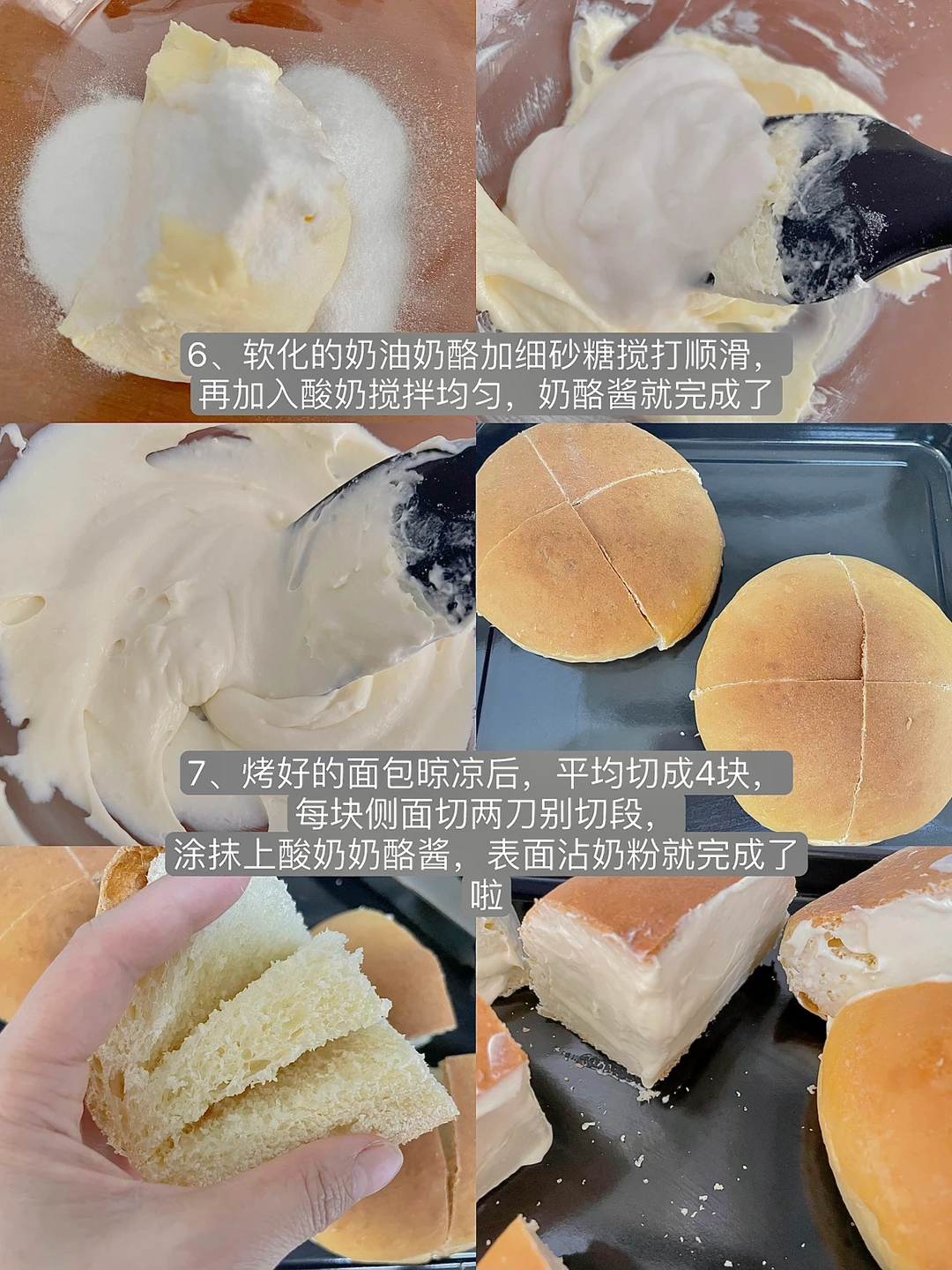 7⃣️烤好的面包晾凉后,平均切成4块,每块侧面切两刀别切段,涂抹上酸奶奶酪酱,表面沾奶粉就完成了