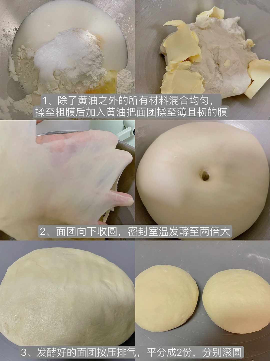 1⃣️除了黄油之外的所有材料混合均匀,揉至粗膜后加入黄油把面团揉至薄且韧的膜
