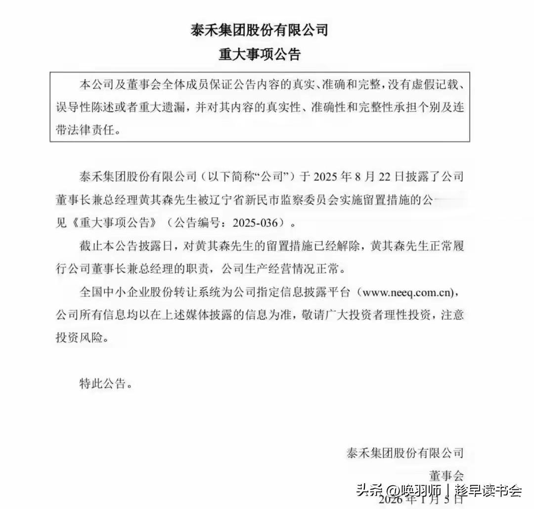2026年1月5日,泰禾集团公告董事长黄其森解除留置措施并复职。四个多月前,他因涉嫌违法被调查,同期公司因长期隐瞒超158亿重大诉讼等违规行为被证监会重罚1740万元。 黄其森回归后,面对的仍是泰禾近700亿元的逾期债务僵局。公司资产被大量查封,诉讼缠身,已于2023年退市。其危机是房地产高杠杆模式崩塌的缩影,与之关联的前高管因受贿数千万元已被判刑。 当前困局中,最受影响的是等待收房的购房者与被拖欠款项的供应商。公司称以“保交付”为首务,但在巨额债务和信用破产的重压下,重组之路异常艰难。此事警示,企业漠视规则、盲目扩张终将付出沉重代价,而化解此类风险、保障民生权益仍是严峻挑战。黄有森 黄在森 黄炜森 黄弘森 黄其昌
