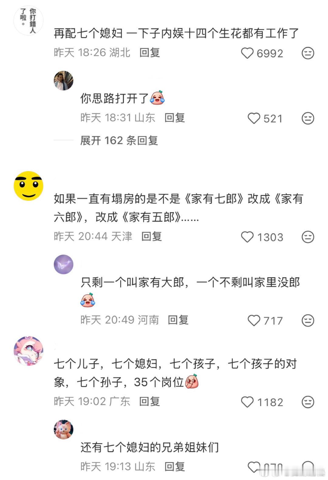 《家有七郎》为时代少年团量身定做的剧本,七个儿子➕七个儿媳妇,一下子给内娱十四个生花提供了工作,还可以有七个孩子,七个孩子对象,内娱活起来了!