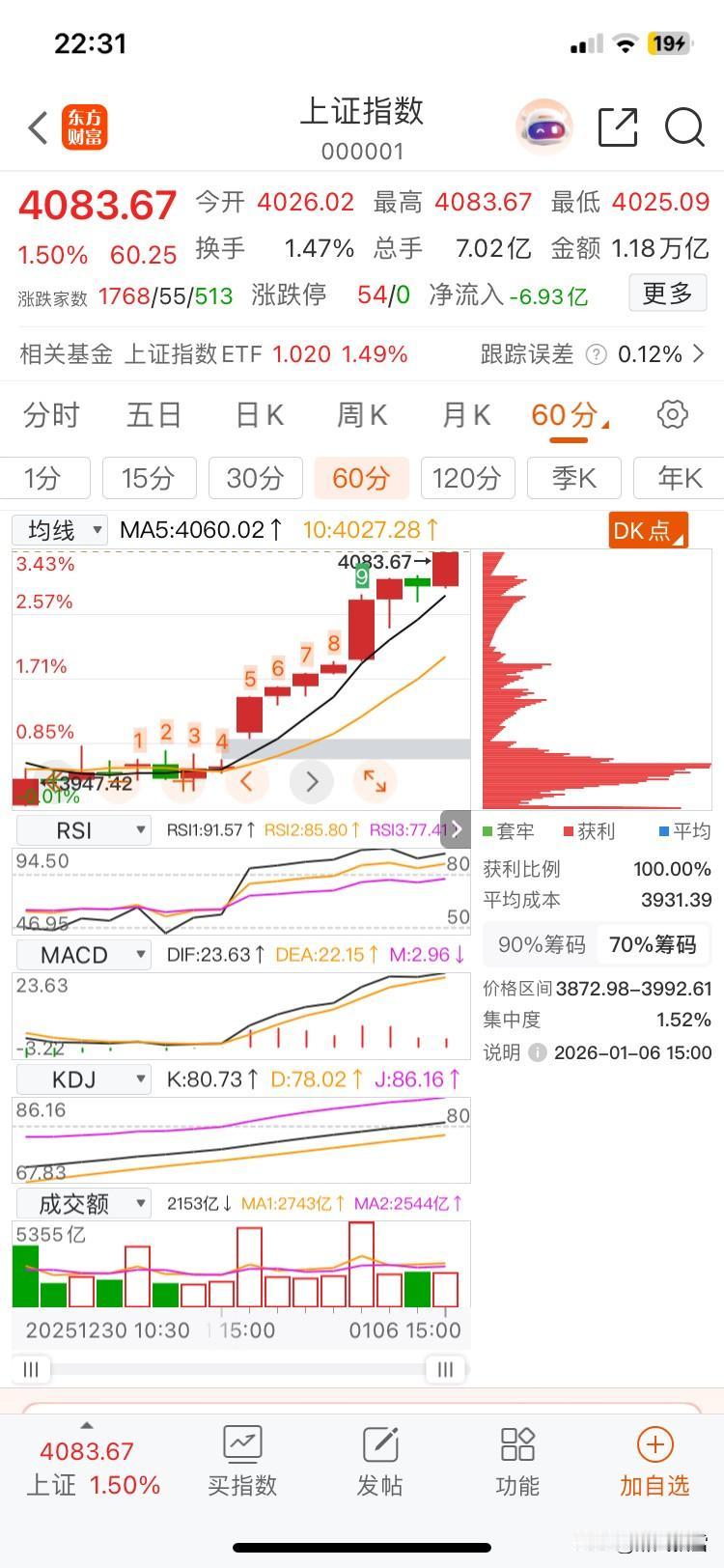 明天一一1月7日走势,14连阳 10:30后沪指60分钟级别放量上攻,全天单边走高,成交量显著放大,机构与主力资金同步净流入且无分歧,多头力量强劲。当前市场趋势明确,单边上涨阶段,回调即是低吸良机,操作需紧扣主线,优先聚焦商业航天核心标的,同时可关注人脑工程晋级标的的短线套利机会,机器人、军工、Ai等次主线,避开无资金支撑的杂毛题材。