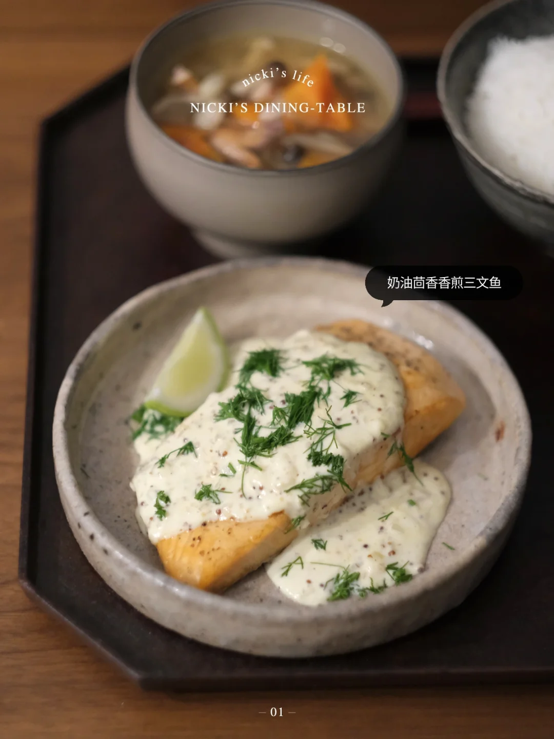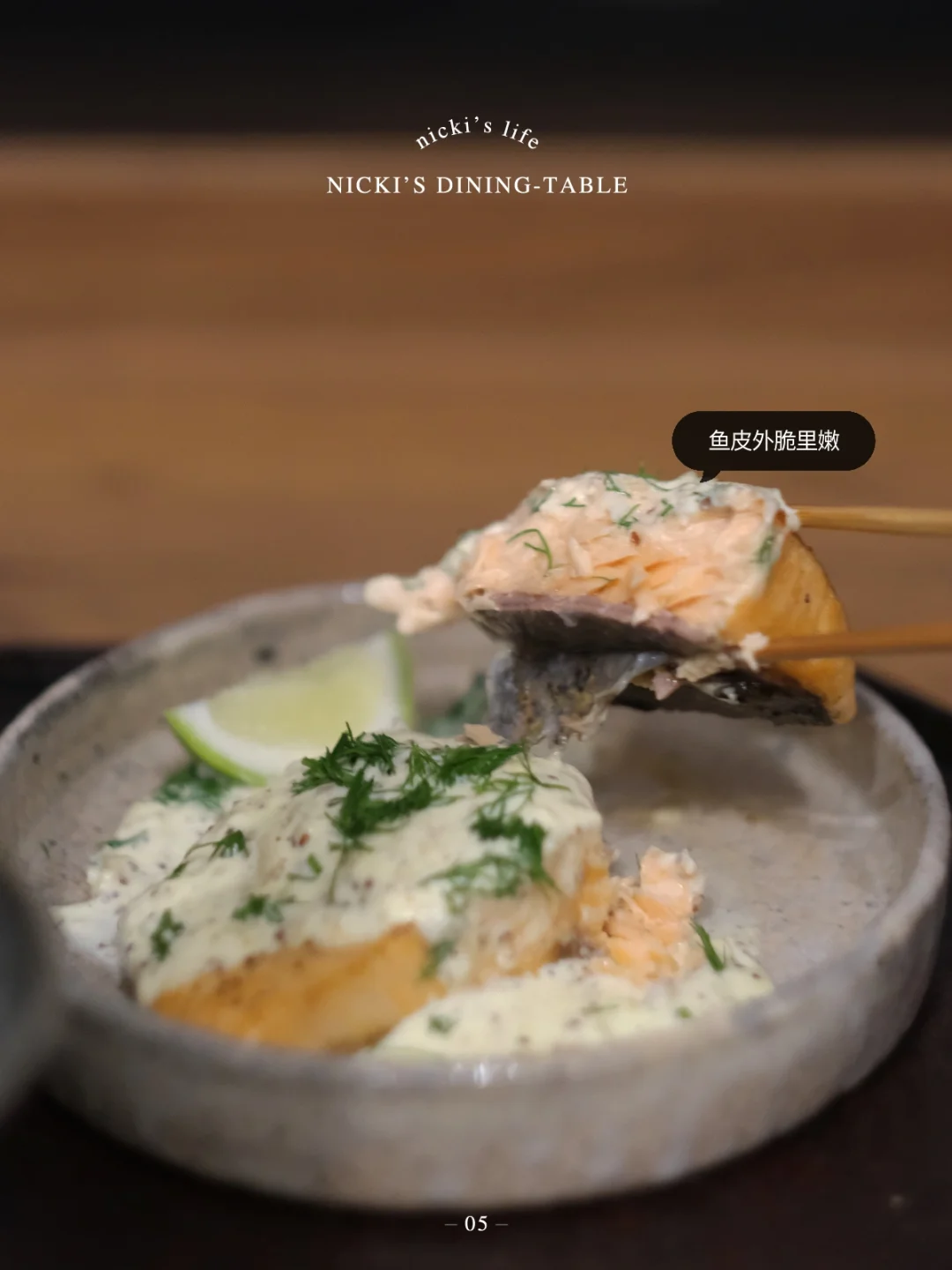 •锅不用洗,放入洋葱末炒出香味后加入1碗淡奶油,1勺黄芥末籽酱,适量黑胡椒,搅匀后淋在三文鱼上,撒上茴香即可。