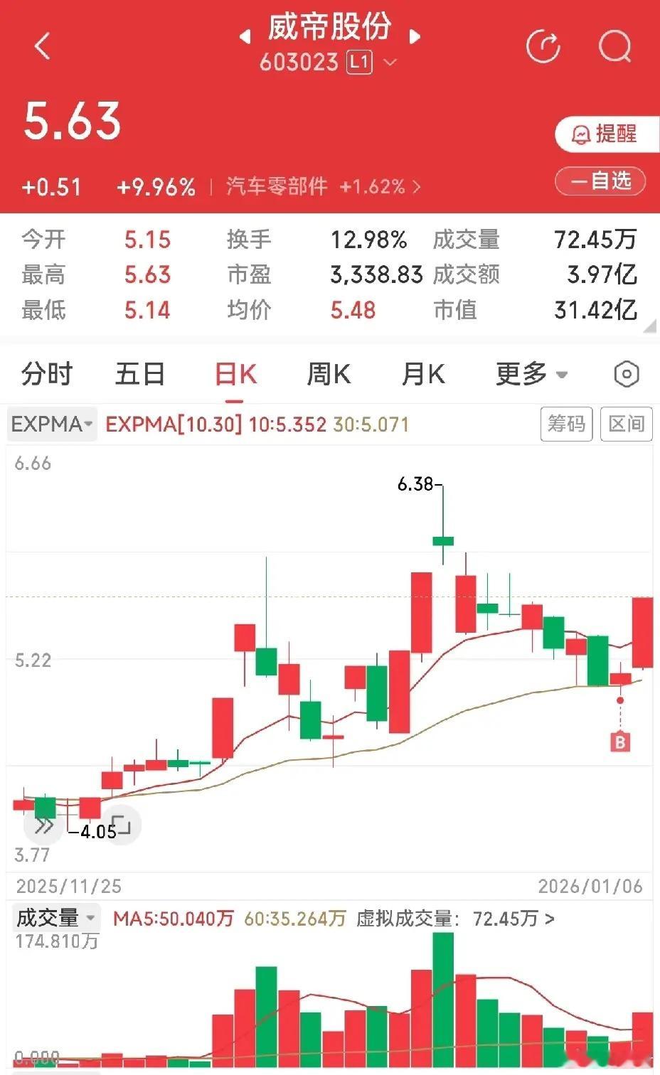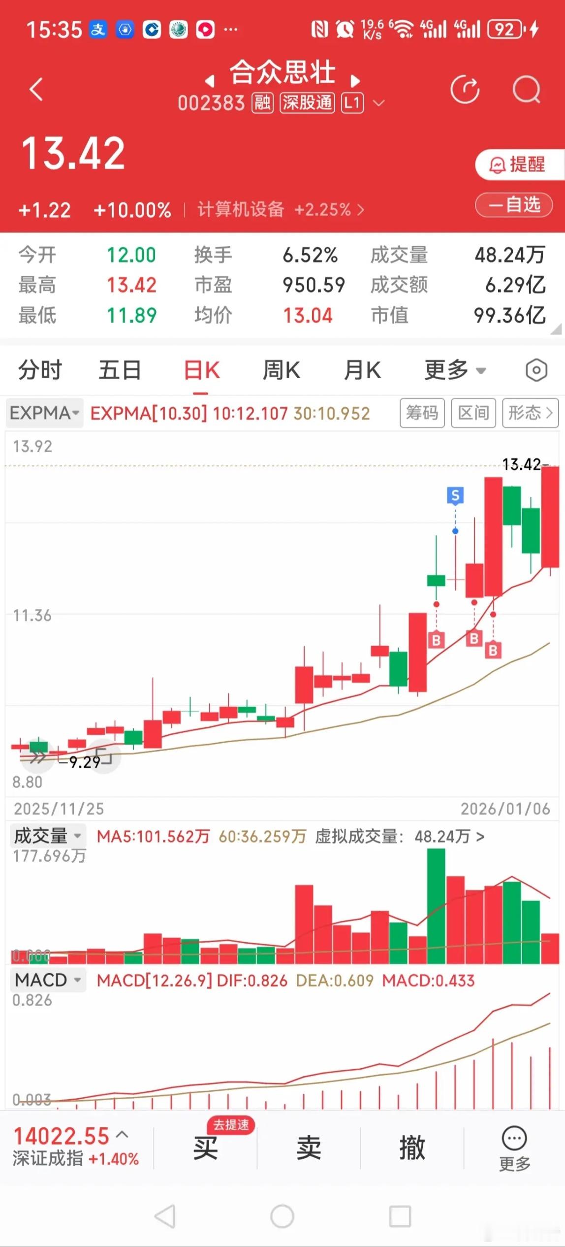 今天下午手握五枚涨停,正得意间,收盘一看,老母鸡变成鸭,只有四枚涨停了。广西广电,中超控股,威帝股份,合众思壮,这四个涨停了。巨力索具,下午涨停,没坚持两分钟就炸板了,让我五涨停梦碎,甚是可惜。广西广电,拿了五天,有三天在下跌,痛苦中煎熬,挺过来了,终见曙光。中超控股,昨天的大跌,是预料中的,所以前面卖出对了,今天的买入是顺势而为,也对了。威帝股份,昨天买的是支撑,因为前面有个长阴短量,今天的涨停虽然是超预期的,但也合乎情理。合众思壮,面对前两个交易日的阴线,我选择了硬扛,因为趋势起来了,不会如此快的结束,扛住了,扛来了涨停。明天会否加速,值得期待。巨力索具,有点看不懂,以持股的态度,向主力和操盘手学习。