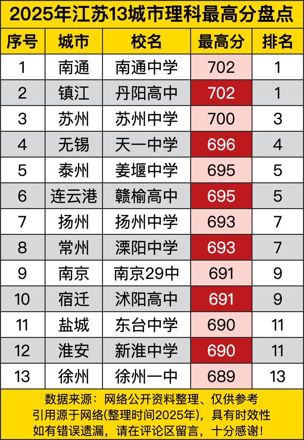 南通中学和镇江丹阳高中直接杀疯啦,都考出了702分的超高分,并列第一。这俩学校就像理科江湖里的两大高手,在分数的武林大会上头碰头,谁也不让谁。这分数,简直是学霸界的珠穆朗玛峰,把其他考生远远甩在身后,让人忍不住竖起大拇指,高呼“厉害厉害”! 再往后看,苏州中学以700分紧跟其后,像个紧紧咬住前面选手的长跑健将。而无锡的天一中学考了696分,排在第四。你看这分数差距,咬得可真紧呐,就好像在说“别想跑,我马上就追上你”。这些学校的学霸们,那脑袋瓜子转得比超级计算机还快,在考场上那是所向披靡。 泰州姜堰中学和连云港赣榆高中都拿到了695分,并列第五。这俩学校就像一对双胞胎学霸,携手闯进了前五阵营。还有扬州中学和溧阳中学,都是693分,并列第七。它们就像理科战场上的两员猛将,你追我赶,互不相让,都想在这场分数较量中多占点地盘。 最末尾的徐州一中考了689分,虽然排在第十三,但也是相当不错的成绩啦。不过和其他学校一比,还是能看出竞争有多激烈。这些学校就像在分数赛道上狂奔的选手,每差一分就可能落后好几个名次。学霸们的世界真是充满了刀光剑影,也希望他们以后都能在各自的领域发光发热哟!