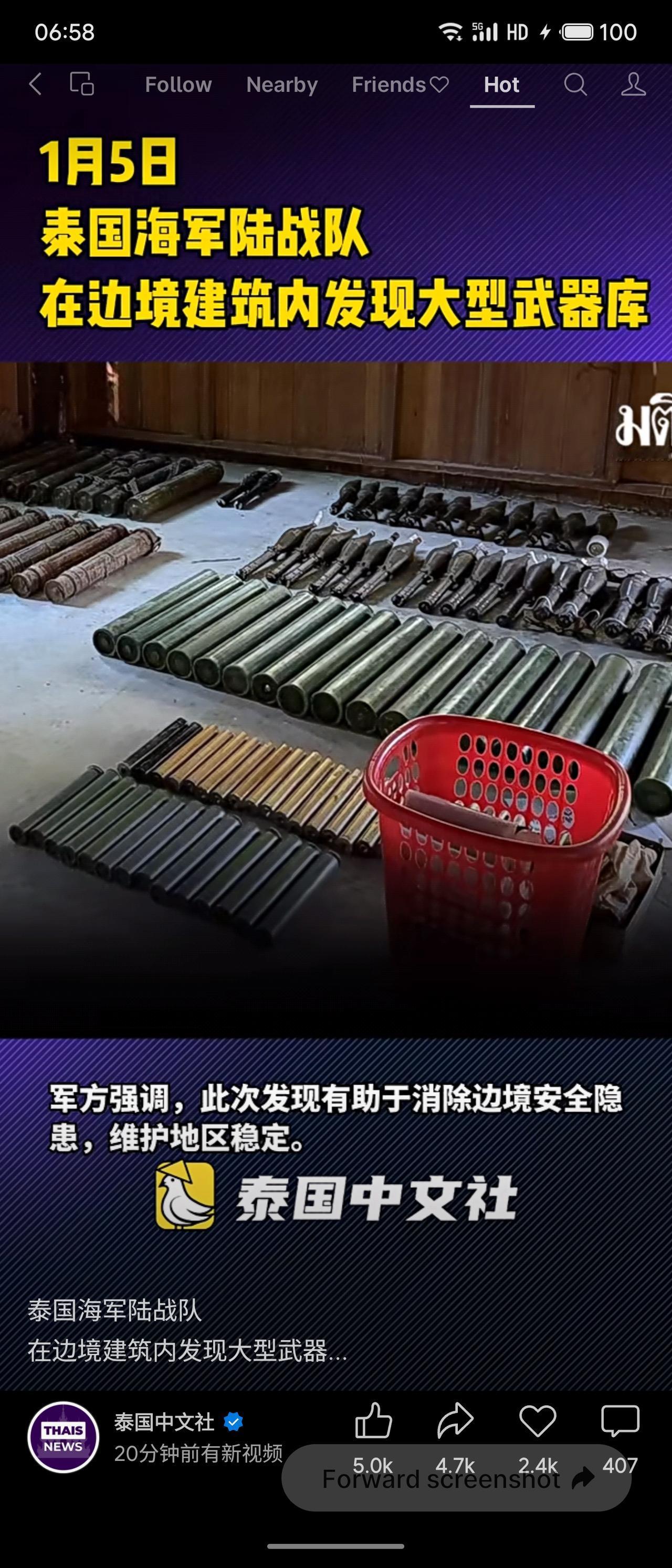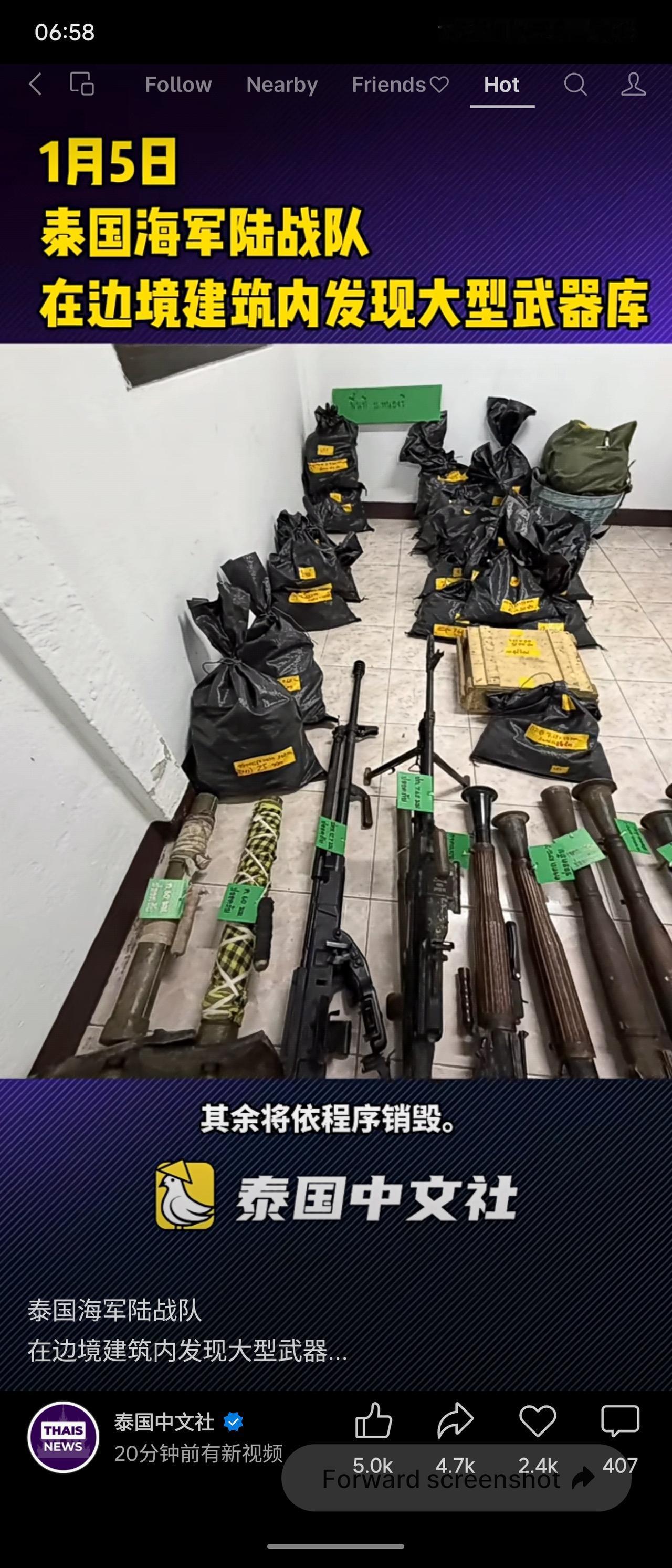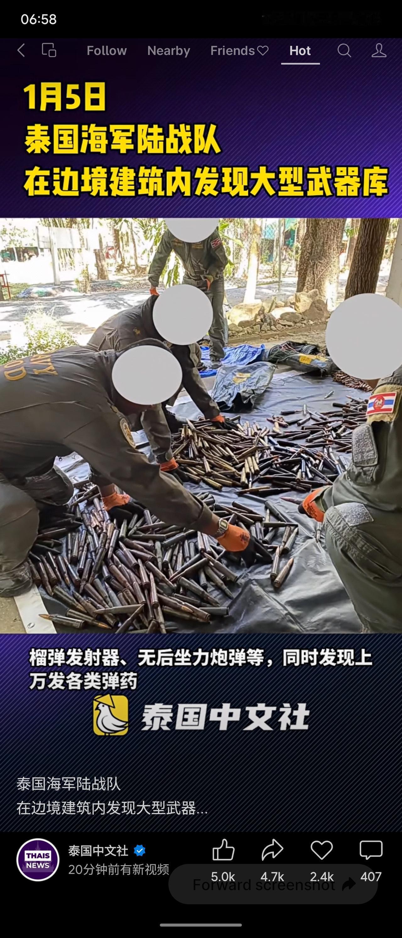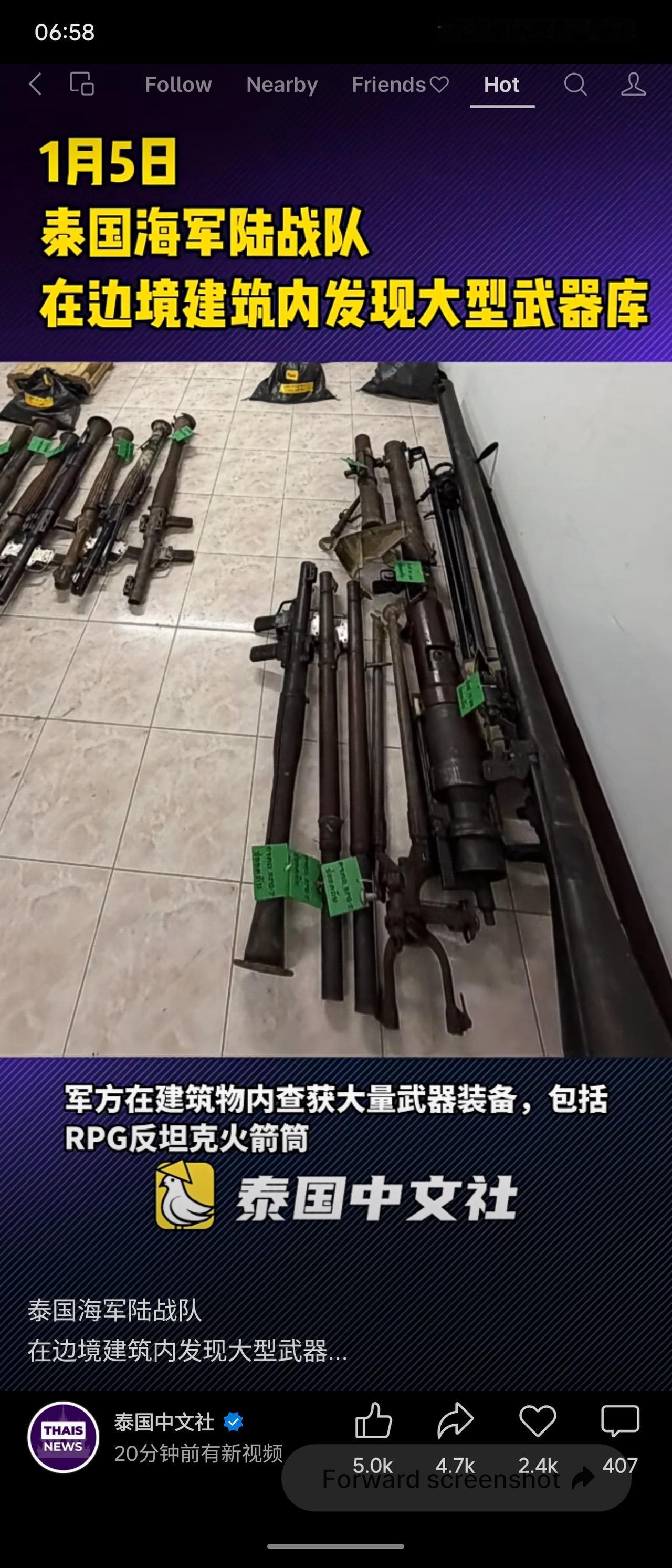 1月5日,泰国海军陆战队在柬埔寨边境建筑内发现大型武器库,查获火箭筒、榴弹发射器等武器及上万发弹药。军方将销毁剩余武器,称此举有助于维护边境安全。