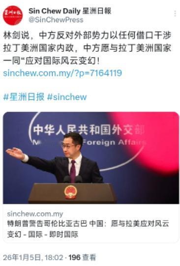 马来西亚星洲日报1月5日晚报道:“特朗普警告哥伦比亚古巴,中国:愿与拉美应对风云变幻。中国外交部发言人林剑说,中方反对外部势力以任何借口干涉拉丁美洲国家内政,中方愿与拉丁美洲国家一同应对国际风云变幻!”   大家都知道,就在警告哥伦比亚、古巴之前,特朗普政府刚干了件更出格的事。他们突袭了委内瑞拉,还把人家总统马杜罗拉走,关到纽约受审。之后还大言不惭地说要“管理”委内瑞拉,甚至放话让美国大型石油公司进去“创造收益”。   这种赤裸裸的军事干预、政权颠覆和资源掠夺,跟当年美国打着“禁毒”的幌子入侵巴拿马、抓诺列加的套路一模一样,本质上就是把“门罗主义”那套霸权逻辑玩到了头。   特朗普自己都曾说“门罗主义是一个成就”,他的政府也一直把这一套当作正式外交政策。这次从突袭委内瑞拉到威胁周边国家,就是想靠铁血手腕震慑整个拉美地区,让各国都乖乖听美国的话,继续保住美国在西半球的独家霸权。   再看特朗普警告的理由,简直荒唐透顶。他攻击哥伦比亚总统佩特罗,说哥伦比亚把毒品卖到美国,还说佩特罗“病得很重”。他甚至进行人身攻击,说佩特罗“这样干的日子长不了”。   有人问他会不会对哥伦比亚动武,他还含糊其辞地说“听起来不错”。针对古巴,他则拿委内瑞拉的石油说事,声称没有委内瑞拉的石油供应,古巴就撑不下去,还倒打一耙说突袭委内瑞拉时“很多古巴人被打死”。   明眼人都明白,这些所谓的“理由”全是借口。真实原因是哥伦比亚、古巴这些国家不肯屈从美国的霸权,还在拉美带头掀起反美风潮,特朗普想通过极限施压把这股风潮压下去。   大家都知道,美国为了控制拉美,向来爱用各种手段干涉别国内政,要么扶持反对派搞骚乱,要么用经济制裁拖垮对方经济,实在不行就直接动武。   这次对委内瑞拉的突袭就是最典型的例子,150架战机从20个基地起飞,把一个主权国家的总统说抓就抓。这种做法连国际社会都看不过去,智利总统博里奇都直言“今天是委内瑞拉,明天就可能是任何一个国家”,这句话道出了拉美国家的普遍忧虑。   更讽刺的是,特朗普竞选的时候还标榜自己是“和平总统”,承诺不会让美国卷入海外战争。结果他上台还不到一年,就已经在委内瑞拉、也门、叙利亚等7个国家动了武,空袭的次数比前总统拜登四年任期的总数还多。   这次在拉美地区的一系列动作,彻底撕下了他“和平缔造者”的假面具,露出了“全球战争贩子”的真面目。美国这种动不动就用武力相威胁、肆意践踏他国主权的做法,严重破坏了国际秩序的根基,也让越来越多的国家看清了美国霸权的真面目。   “门罗主义”诞生两百多年,带给拉美的从来不是和平发展,而是没完没了的动荡、干涉和掠夺。美国靠着挑动分裂、发动战争、控制资源这些手段,把拉美当成了自己的提款机,让无数拉美老百姓吃尽了苦头。   就在特朗普政府在拉美大搞霸权扩张、制造混乱的时候,中国的表态和做法跟美国形成了鲜明对比。中国外交部发言人林剑明确表示,反对外部势力以任何借口干涉拉丁美洲国家内政,愿意和拉美国家一同应对国际风云变幻。   这不仅是对美国霸权行径的有力反击,更是坚定支持拉美国家的主权和发展权利。事实上,中国和拉美国家合作,从来都是互利共赢,跟美国那种霸权掠夺完全不一样。   这些年,靠着中拉合作论坛,中国和拉美国家在经贸、基建、能源等好多领域都开展了深度合作。钱凯港开通后,秘鲁到亚洲的运输时间缩短了十几天,物流成本也降低了20%以上。   中国新能源汽车企业在巴西建了厂,带动了两万多个就业岗位。中资企业在巴西、智利建的光伏项目,给当地提供了大量清洁电力。   2025年,中国还向拉美国家提供了660亿元人民币的信贷额度,支持双方在科技创新、数字经济这些领域深化合作。这些合作实实在在提升了拉美国家的发展能力,也让拉美人民感受到了平等相待、互利共赢的温暖。   现在的国际格局,早就不是美国一家独大、说一不二的时代了,拉美国家也不再是任人宰割的羔羊。越来越多的拉美国家已经觉醒,主动找多元化的发展路子,不肯再被美国绑在霸权的战车上。   特朗普政府想靠复辟“门罗主义”重新控制拉美,肯定是白费力气。而中国一直坚持不干涉别国内政的原则,尊重拉美国家自己的选择,愿意跟拉美国家一起应对国际上的风风雨雨。   这种合作模式既符合中拉双方的共同利益,也为维护国际公平正义、促进全球发展出了力。接下来,美国在拉美的霸权行径越升级,就会有越多拉美国家看清它的真面目,主动向中国靠拢,中拉合作的联系也会越来越紧密。   毕竟,谁是真心为拉美好,谁是想把拉美当成殖民地,拉美人民心里最清楚,国际社会也都看在眼里。美国想靠威胁和武力维持霸权的时代已经过去了,尊重主权、平等合作才是大趋势。这一点,就算特朗普政府再不甘心,也得面对现实。