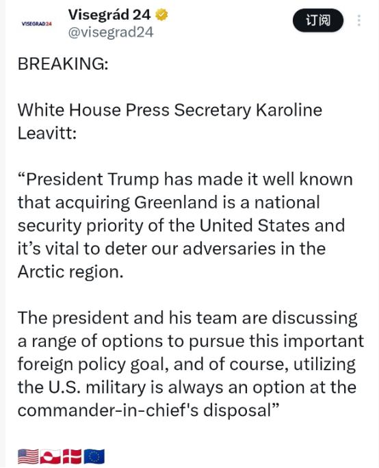 白宫新闻秘书卡罗琳·莱维特北京时间1月7日表示:“特朗普总统已经明确表示,获得格陵兰岛是美国的国家安全优先事项,对于威慑我们在北极地区的对手至关重要。总统及其团队正在讨论一系列实现这一重要外交政策目标的方案,当然,动用美国军队始终是三军统帅可以采取的选项之一。” 格陵兰岛不是什么不毛之地,就是一座实实在在的资源宝库。美国地质调查局有明确数据,这里的稀土储量高达150万吨,占了全球已探明储量的四分之一。 稀土是芯片制造、军工生产和新能源产业的必需材料,刚好是美国现在产业升级、维持军事优势最缺的关键东西。除了稀土,岛上还有175亿桶没开采的石油和4.15万亿立方米天然气。现在全球能源格局乱得很,这些资源足够让任何国家眼馋。 更关键的是,全球气候越来越暖,格陵兰岛的冰盖融化得越来越快,以前难开发的资源,现在开采难度大大降低。这片曾经的“冰封之地”,早就成了美国眼里伸手就能拿到的肥肉。 资源只是其中一个原因,格陵兰岛的地缘战略价值更让美国馋得不行。它是世界上最大的岛屿,坐落在北美洲东北部,夹在北冰洋和大西洋中间,一边挨着北美加拿大,一边能望见欧洲大陆,称得上是“通两洋、瞰两陆”的战略要地。 尤其是北极航道的价值越来越突出,走这条航线能大幅缩短亚欧之间的航运距离。从上海到欧洲,走北极航道比走苏伊士运河近差不多10天,比绕走好望角更是能省近30天。 随着冰期变短,这条航道以后的商业通航价值还会继续提升。而格陵兰岛正好卡在这条航道的咽喉位置,掌控了它就等于握住了北极航运的主动权。 既能监视往来的船只,又能遏制其他国家借着北极航道扩大影响力,这对一心想巩固全球霸权的美国来说,肯定是必争之地。更不用说,这里还是部署弹道导弹预警系统、搜集北极地区情报的好地方,能全方位威慑俄罗斯等北极国家,筑牢美国在北极的地缘支点。 其实美国觊觎格陵兰岛不是一天两天了,早就贼心不死。远在1867年,美国就和丹麦谈过想买这座岛,最后没成。到了1946年,杜鲁门政府又出价,想用1亿美元黄金再加上阿拉斯加部分油田的开采权换格陵兰岛,结果又被丹麦拒绝了。 就算这样,美国也没放弃渗透。1951年,它和丹麦签了国防协议,在岛上建了军事基地,现在这座基地已经升级成了太空监测基地,成了美国在北极的重要军事存在。特朗普上台后,干脆把这份野心摆到了台面上。 2019年他就公然提出要“购买”格陵兰岛,再次当上总统后,不仅多次放话要“志在必得”,还专门任命了格陵兰岛特使,把夺取这座岛列为“国家安全优先事项”。 他们讨论的方案五花八门,从“购买”“建立自由联系国协定”到“动用军队”,什么手段都想用上,甚至想在中期选举前快速掌控格陵兰岛,那副急功近利的霸权嘴脸暴露得一览无余。 更讽刺的是,美国和丹麦都是北约成员国。按照《北大西洋公约》第五条,美国本来该对丹麦管辖的格陵兰岛负起防御责任,现在倒好,反而动不动就威胁要动武,这简直是公然背叛盟友体系。 面对美国的嚣张气焰,丹麦和格陵兰岛自治政府早就明确表示反对了。丹麦首相直接说,要是美国攻击北约盟友,“一切都将终结”,包括北约和战后安全体系。 格陵兰岛自治政府总理更是怒斥美方的言论“完全不可接受”,强调自己的领土完整受国际法保护,绝对不接受被吞并的图谋。 法国、德国、意大利等欧洲国家也一起发声,坚定支持丹麦和格陵兰岛的主权。北欧五国还专门发表声明,明确格陵兰岛的事务只能由丹麦和格陵兰岛自己决定。 美国之所以敢这么肆无忌惮,说白了就是把格陵兰岛当成了自家“后院”的猎物。它想照搬在委内瑞拉用过的那套极限施压手段,靠军事威胁和政治渗透逼对方屈服。 可美国忘了,时代早就不一样了,不是它想强取豪夺就能得逞的。欧洲盟友集体反对,让美国的霸权行径陷入了孤立。有国际法和国际准则管着,它那套“动武”的叫嚣也只能停在口头上。 更重要的是,美国这种动不动就用武力威胁盟友、践踏他国主权的做法,正在不断撕裂跨大西洋关系。连丹麦都把美国当成了潜在安全威胁,北约和欧盟也面临着破裂的风险。 说到底,美国口中的“国家安全”,从来都是服务于自己霸权的借口。从盯着格陵兰岛的资源和航道,到想靠武力巩固自己的地缘优势,特朗普政府的每一步操作,都写满了“唯我独尊”的霸权逻辑。 它以为凭着自己的军事实力就能为所欲为,却忘了人心向背,也忽略了国际社会的普遍反对。这场霸权闹剧到最后,只会让美国在国际上更孤立,也让全世界都看清它强取豪夺的真实面目。所谓“拿下格陵兰岛”,终究不过是美国一厢情愿的霸权幻想而已。