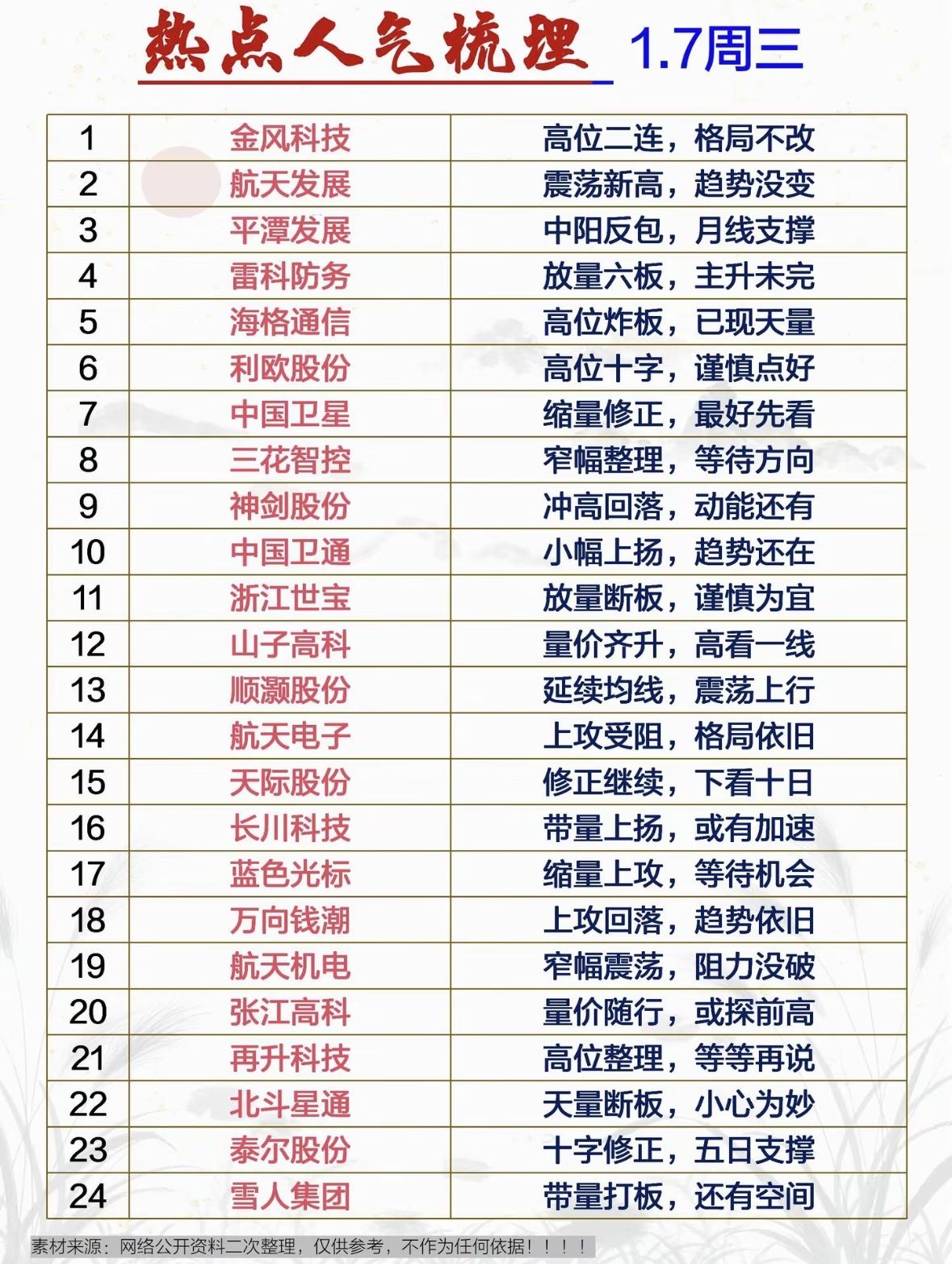 1.7周三热点人气梳理,投资参考! 科技股分化震荡,金风航天趋势强劲,雷科防务主升延续,高位炸板需谨慎,量价齐升看突破,窄幅整理待方向。