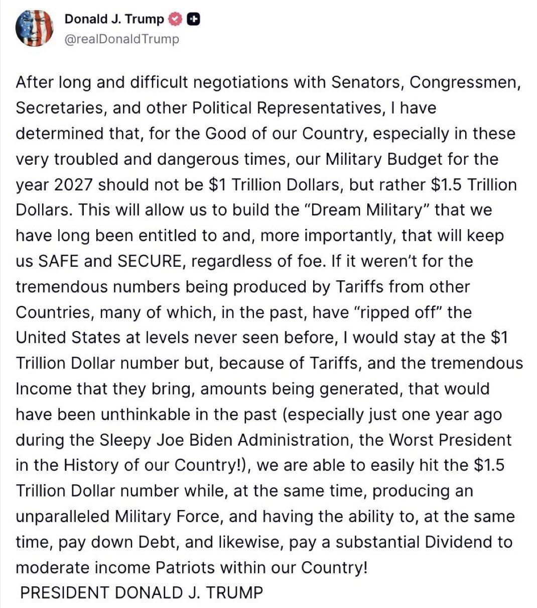 突发新闻——特朗普宣布,美国2027财年军费预算应为1.5万亿美元,而非此前计划的1万亿美元。