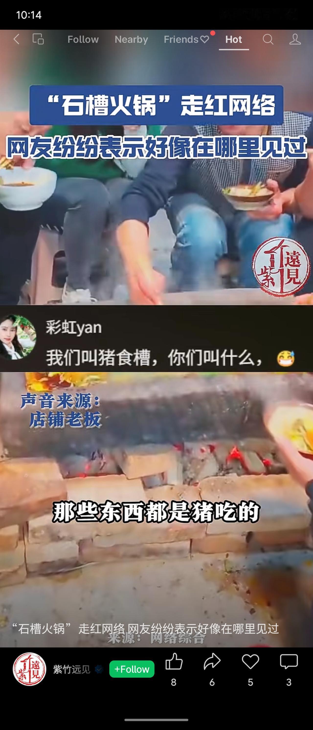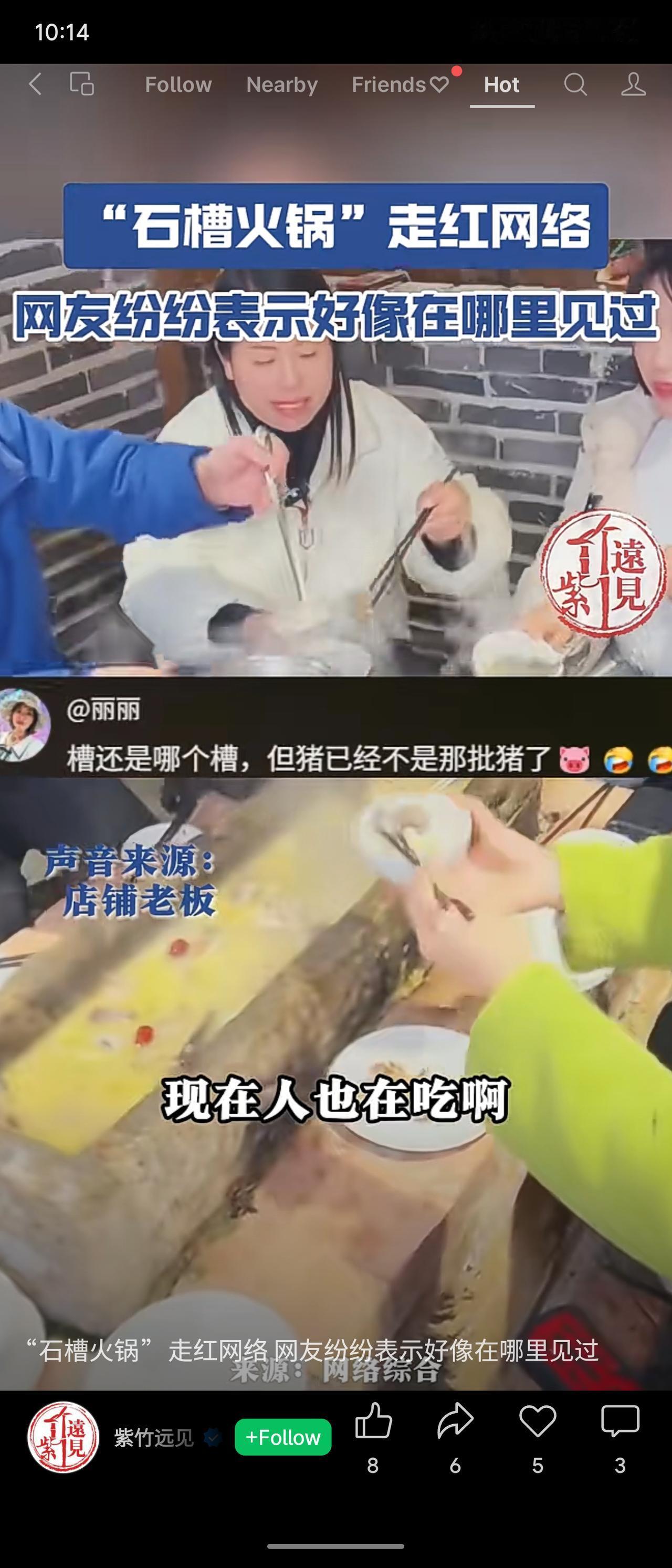 “石槽火锅”近期走红,其容器被网友认出实为传统猪食槽,引发“槽还是那个槽,但猪已经不是那批猪了”等幽默评论。店铺老板坦言“现在人也在吃”,形成一种接地气的趣味反差。