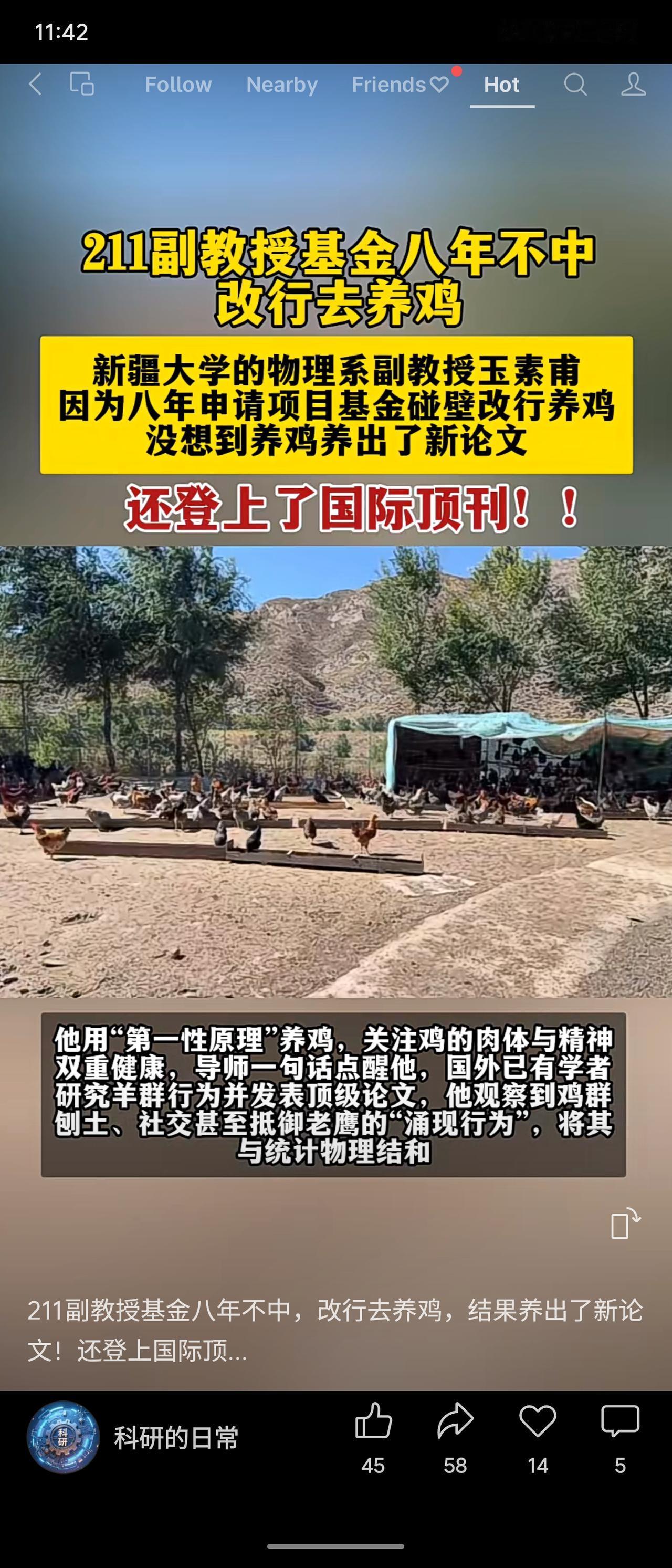 晒图笔记大赛新疆大学物理副教授因八年未获科研基金,转行养鸡却跨界成功。他将物理学“第一性原理”用于研究鸡群行为,相关成果登上国际期刊,意外开辟科研新路径。