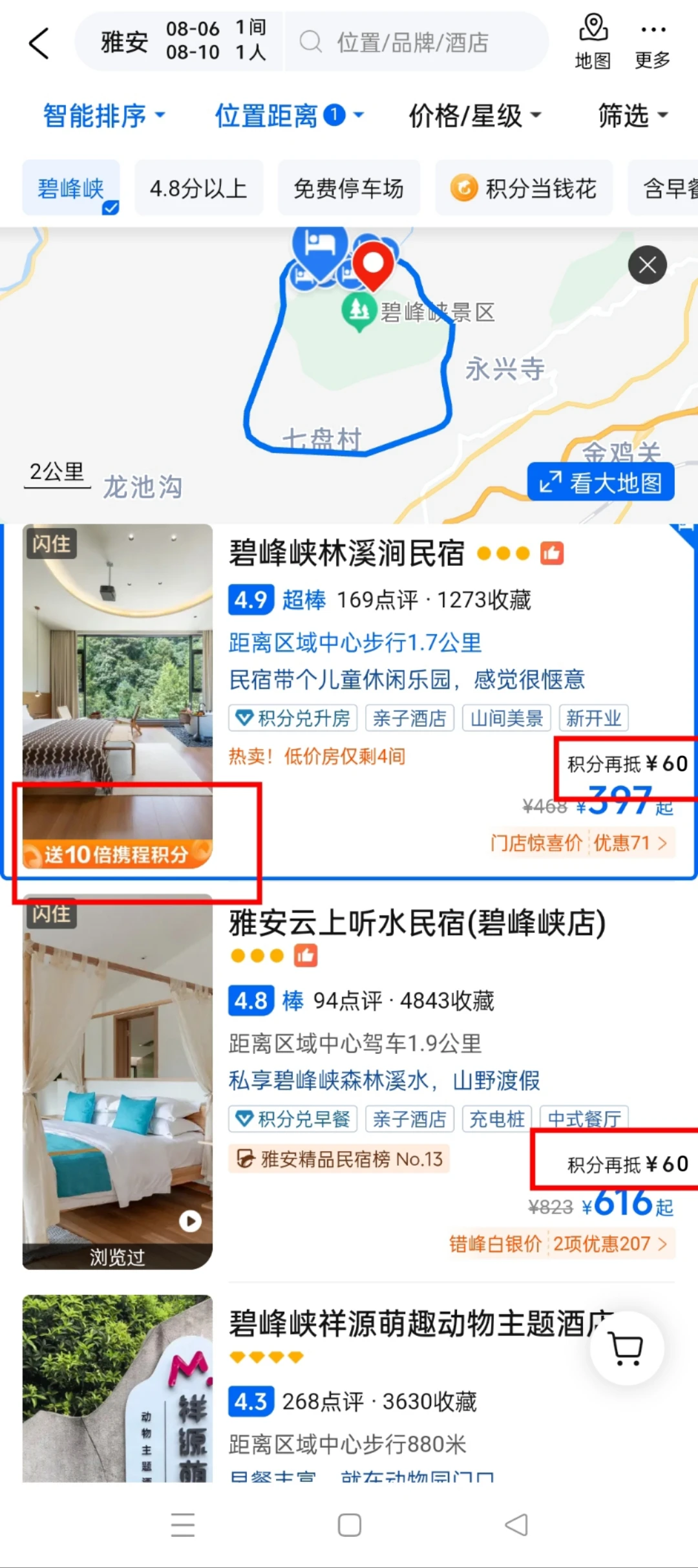 成都盆地最近实在太闷热,看到有个这个夏天不过热门款 的倡议!为了那张机票,找个小众地方避避暑,我必须参赛!推荐一下雅安碧峰峡。 📍雅安碧峰峡 🚗自驾,从成都出发,约2小时 tips:推荐碧峰峡峡谷、熊猫基地(野生动物乐园就不推荐了,毕竟那是我见过最恨钱的景区) 🎫:💰100,包括了熊猫基地➕峡谷景区的门票➕游客中心进景区的摆渡车➕峡谷电梯。 Day1:抵达雅安。因为天气热,熊猫活动一般在早上,所以我们选择了第二天一早去熊猫基地,下午先去碧峰峡。 碧峰峡分为左右两个峡谷,左峡谷7.5公里,右峡谷2.5公里,体力有限可以选右峡谷,耗时一个小时左右,空气很好,景色非常雷同青城后山。左峡谷,基本全程下坡,站在太阳下会有点热,阴影处比较凉爽。一直走到青云梯。如果不想坐电梯,也可以步行上去,28层,10分钟出头。 总的来说,碧峰峡的景色不算太惊艳,胜在有峡谷、瀑布、深潭,以及峡谷里的凉爽,是个避暑好地方。 Day2:一早,在酒店门口可以等景区大巴去熊猫基地,8点30以前可以赶到香香的园区,香香公主铁定出来吃早饭。为了直冲豹子山,买了💰20的观光车门票。然后可以慢慢参观海龟园、幼儿园和成年熊猫区。实地去了碧峰峡,不得不为基地说句公道话:这里的环境真的很好,每只熊猫都坐拥一个山头,活动空间非常大,可自由出入宿舍。熊猫看起来都白白胖胖,还算干净。希望崽崽们愉快健康生活在这里。 悠闲看完熊猫,就可以返程啦 关于住宿:这次选择的民宿#云上听水#非常舒服,宠物友好(疯狂上分)。大大的落地窗面对峡谷满眼绿,心静自然凉。门口的小溪流水质清澈可以玩水,带娃带宠都是好选择。我这次携程订的,用会员积分抵扣了60元,虽然不多,但主打一个该省省该花花,可以认准“积分当钱花”标识。退房还返十倍积分抵123元直接到账户。建议大家订房前看看自己的积分 。 PS:那些说被资本做局杀熟的科普:越早订房,越可能便宜。记得提早规划出行时间。一般大酒店集团会有提前7天,14天的促销政策,酒店为了平衡收益,越是接近当天调价频率越高。如果迫不得已临时订房,记得√积分抵扣房费选项,大概率可以凭携程积分抵扣掉溢价部分!