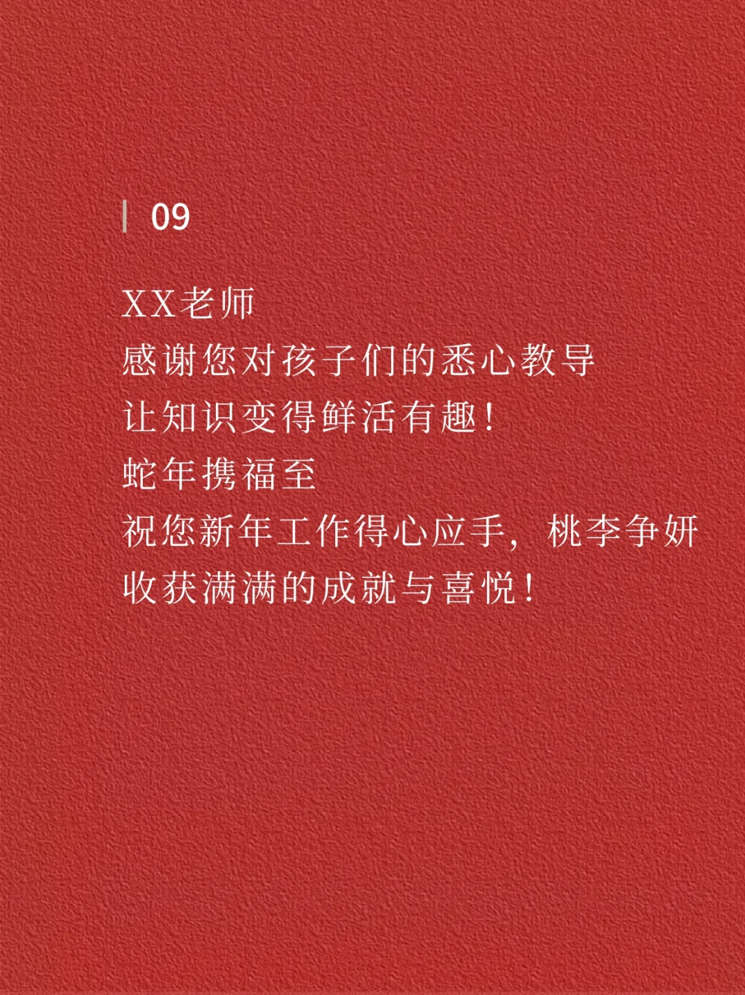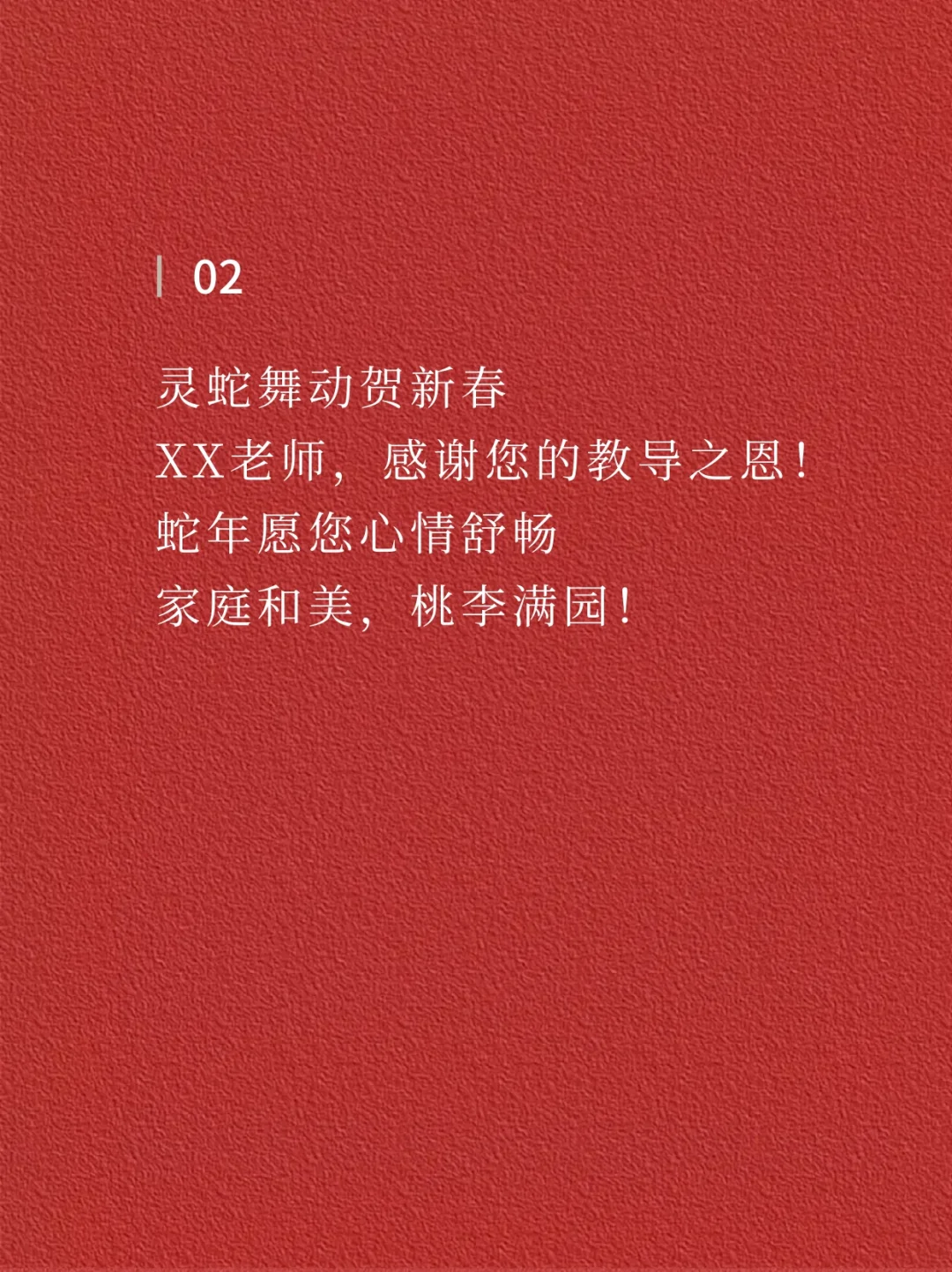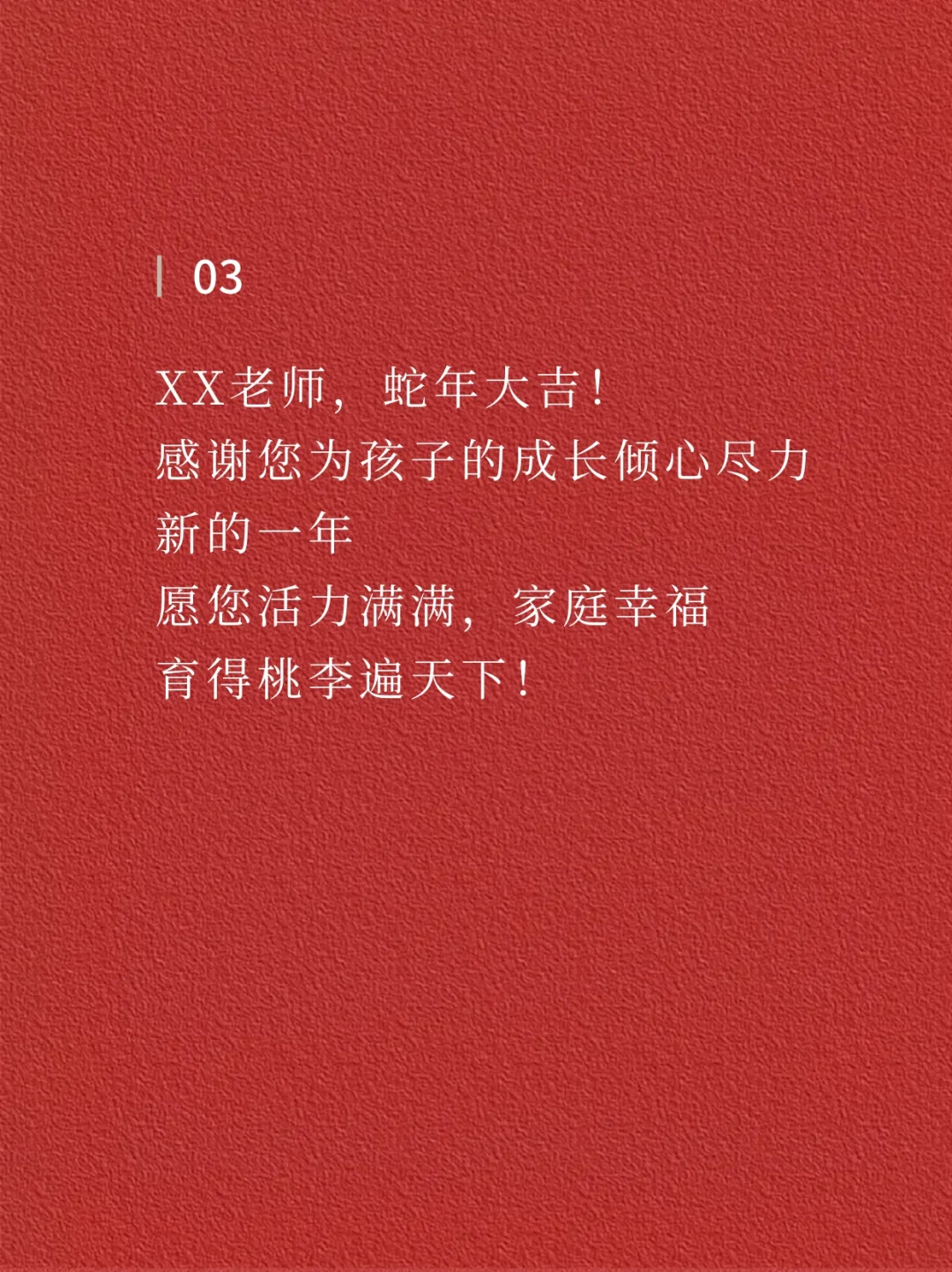 XX老师,蛇年大吉!感谢您为孩子的成长倾心尽力,新的一年愿您活力满满,家庭幸福,育得桃李遍天下!