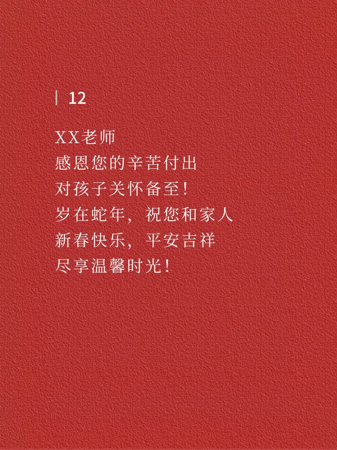 XX老师,感恩您的辛苦付出,对孩子关怀备至!岁在蛇年,祝您和家人新春快乐,平安吉祥,尽享温馨时光!
