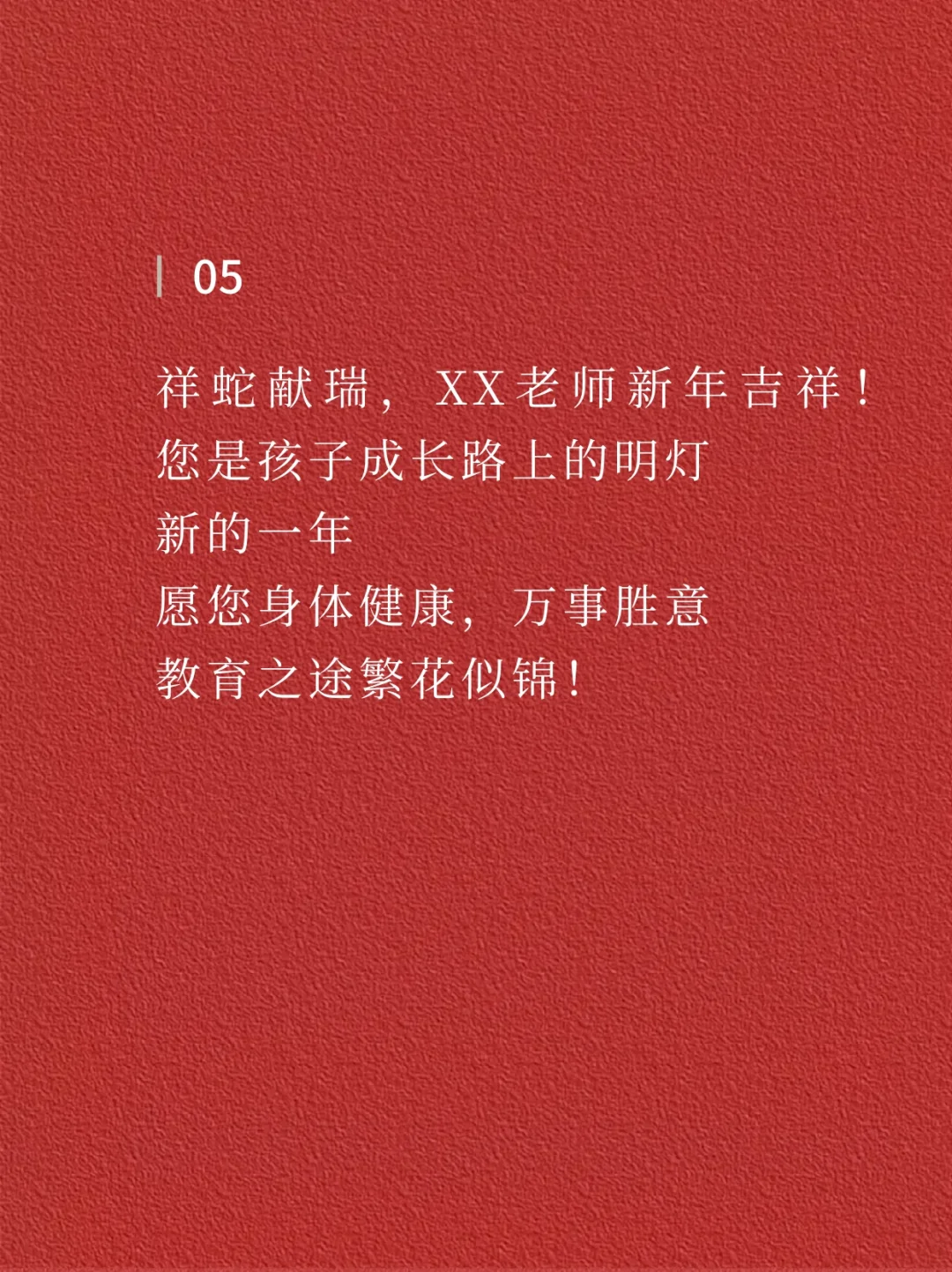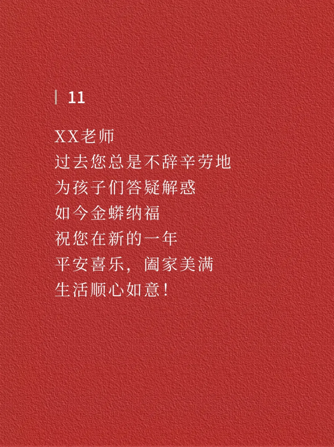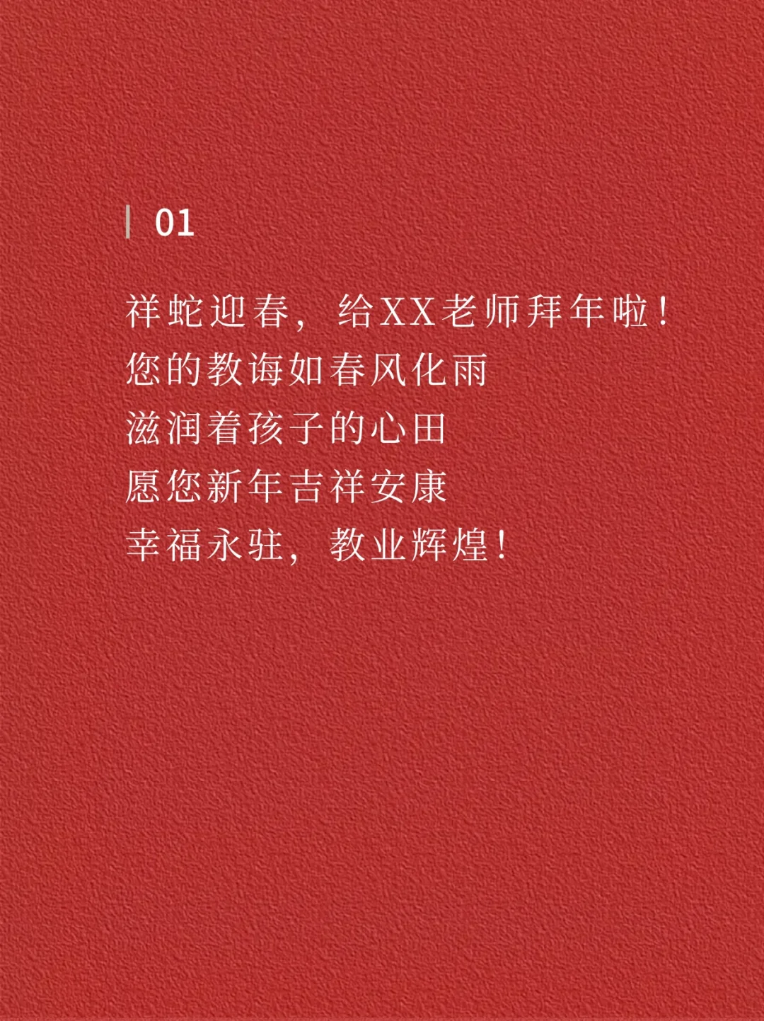 XX老师,过去您总是不辞辛劳地为孩子们答疑解惑,如今金蟒纳福,祝您在新的一年平安喜乐,阖家美满,生活顺心如意!