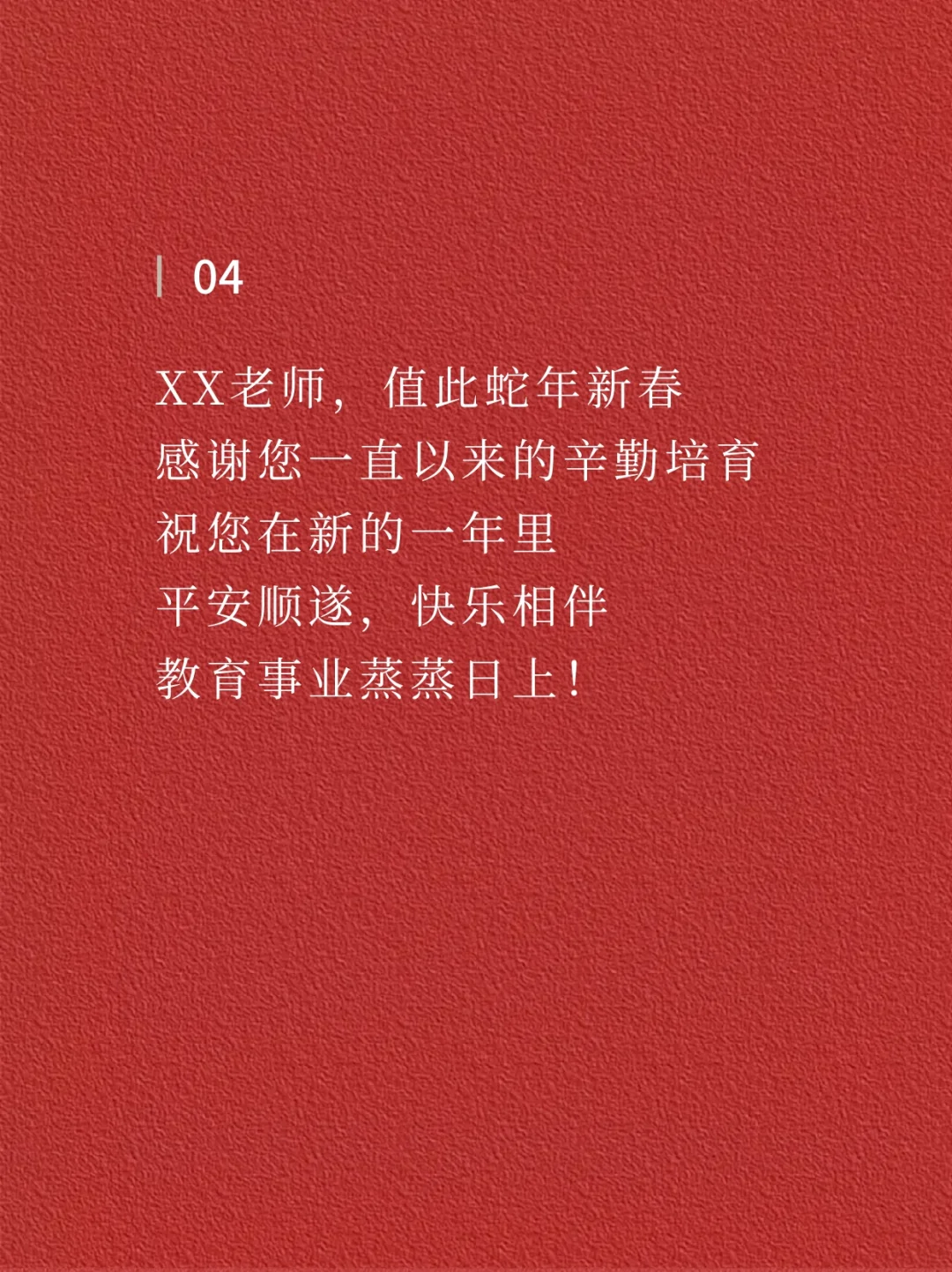 XX老师,值此蛇年新春,感谢您一直以来的辛勤培育,祝您在新的一年里平安顺遂,快乐相伴,教育事业蒸蒸日上!