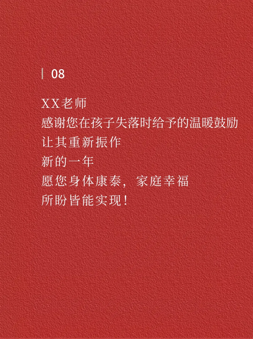 XX老师,感谢您在孩子失落时给予的温暖鼓励,让其重新振作!新的一年,愿您身体康泰,家庭幸福,所盼皆能实现!