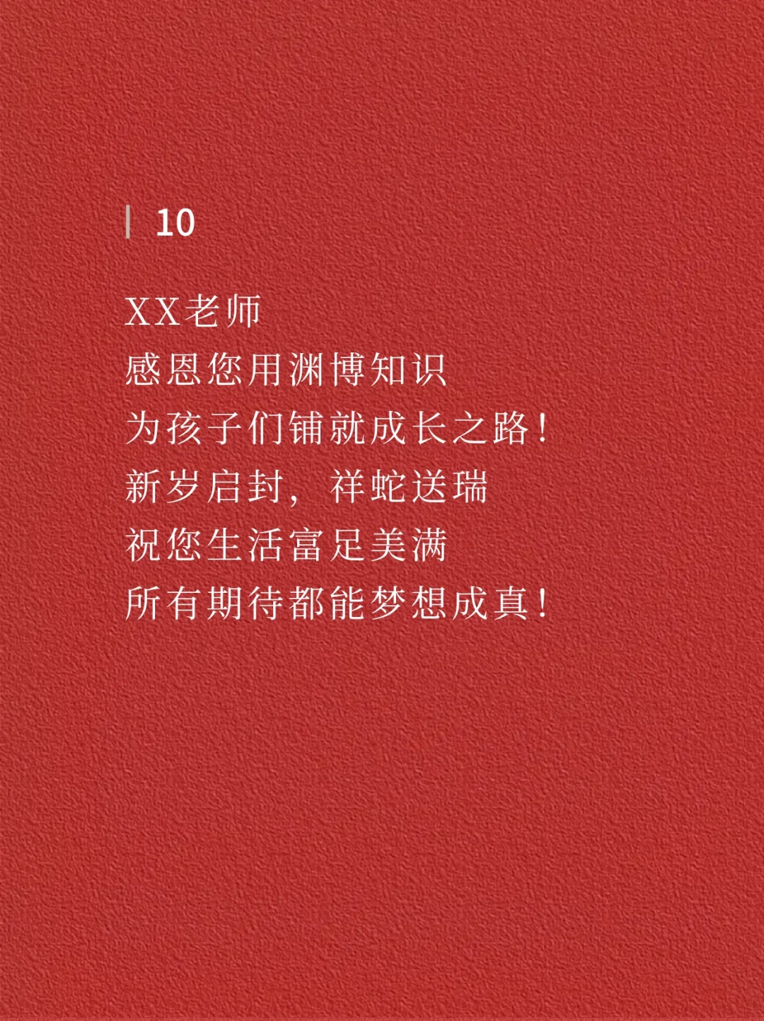XX老师,感恩您用渊博知识为孩子们铺就成长之路!新岁启封,祥蛇送瑞,祝您生活富足美满,所有期待都能梦想成真!