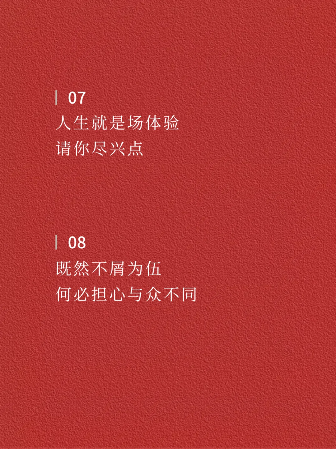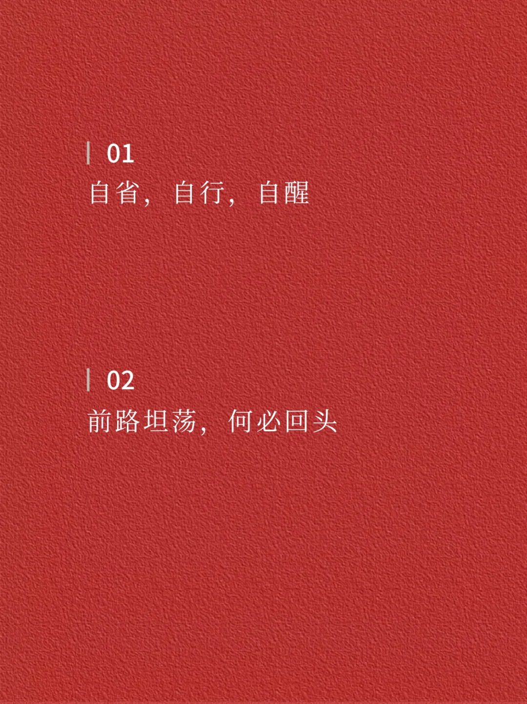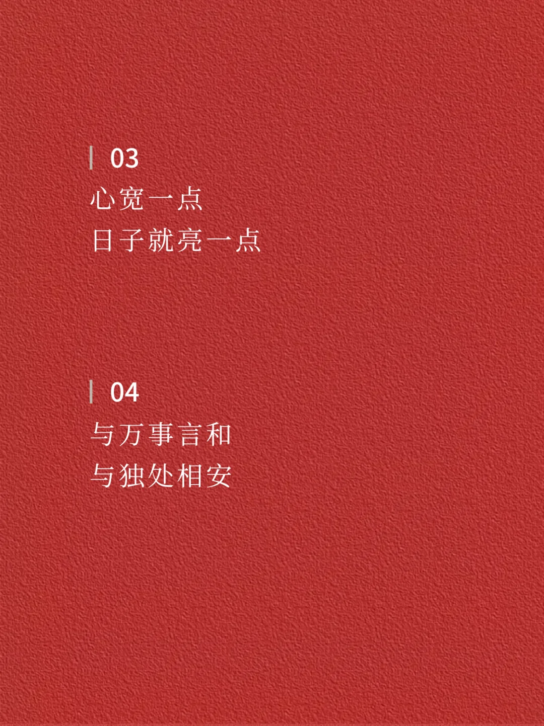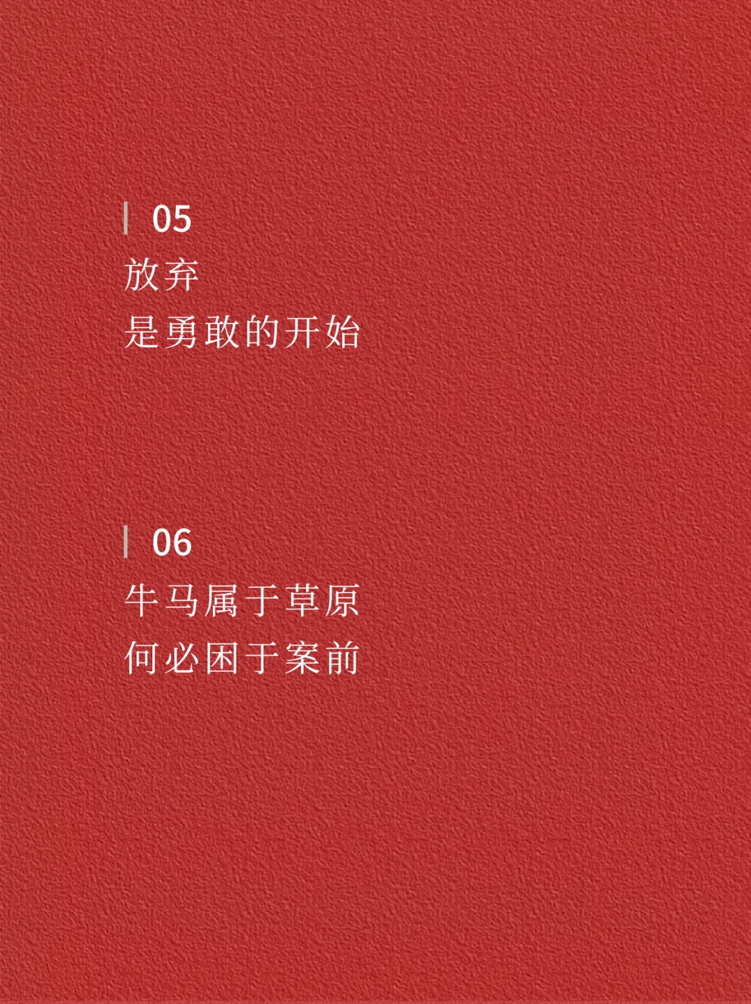 🌿🌿 01 自省,自行,自醒 · 02 前路坦荡,何必回头 · 03 心宽一点 日子就亮一点 · 04 与万事言和 与独处相安 · 05 放弃 是勇敢的开始 · 06 牛马属于草原 何必困于案前 · 07 人生就是场体验 请你尽兴点 · 08 既然不屑为伍 何必担心与众不同 · 09 这世界没有真相 只有视角 · 10 你涉水而过 不代表你拥有这条河 · 11 不要让别人成为你的习惯 操纵你的生活 · 12 人生没有最好的年纪 只有最好的状态 · ✨✨ —The end— 🌈感谢阅读