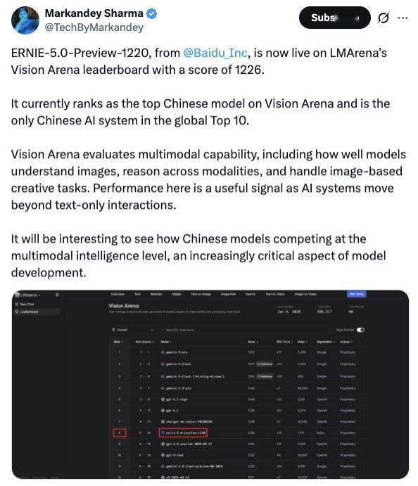 【LMArena视觉榜前十,终于出现中国名字!文心5.0凭“硬核实力”拿下中国第一】 在刚刚更新的全球权威大模型评测平台LMArena视觉理解榜(Vision Arena)上,一个中国名字首次闯入全球前十——百度文心大模型ERNIE-5.0-Preview-1220以1226分的成绩位列中国第一、全球第八,成为该榜单中唯一进入全球前十的中国大模型。这不仅是一次排名的突破,更是国产大模型在多模态视觉理解领域跻身国际一流梯队的重要标志。 值得强调的是,LMArena并非传统意义上的学术评测,而是一个“实打实用户对战”平台。其排名完全基于全球用户的真实使用和直接对比投票产生,每一条数据背后都是用户在不同模型之间的实际选择。这种机制确保了榜单的客观性与公信力,也意味着文心5.0的第八名,不是实验室指标,而是来自全球用户的真实认可。 在与同榜模型的直接对比中,文心5.0 Preview展现出了令人信服的竞争力。它综合得分超越了Gemini-2.5-Flash、GPT-5-Chat、Qwen3-VL等国内外知名多模态模型。尤其在“创意写作”这一考验视觉理解与跨模态生成能力的子项中,文心5.0高居全球第二,仅次于Gemini-3-Pro。这说明,中国模型不仅在基础视觉识别上达标,更在需要深层次理解与创造的高阶任务中,站到了世界前列。 此次突破,根植于文心大模型持续的技术积累。去年11月发布的文心5.0,作为参数规模达2.4万亿的原生全模态大模型,从设计之初就致力于统一理解和生成文本、图像、音频、视频等多模态信息。从去年11月登顶LMArena文本榜国内第一,到本次视觉榜跻身全球前十,文心5.0 Preview系列在国际权威评测中稳步前进的步伐清晰可见。 业内观点认为,文心大模型在LMArena这类“实战型”榜单中持续取得突破,标志着国产大模型已不仅仅是“跟随”,而是开始在国际公认的竞技场上展现体系化竞争力。中国AI模型正从技术追赶,逐步转向与全球顶级模型同台竞技、在某些细分领域实现并跑甚至领跑。 榜单上一个名字的变化,背后是中国AI产业多年投入与迭代的缩影。文心5.0此次进入全球视觉理解前十,如同打开了一扇窗,让世界看到:在人工智能的核心赛道上,中国模型不仅有名字,更有实实在在的战斗力。这场靠“用户对战”赢来的认可,或许只是一个开始,它预示着国产大模型在全球AI竞争中,将拥有更多话语权与可能性。