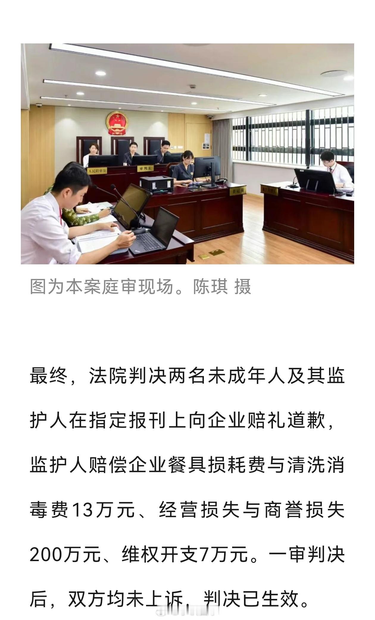 往火锅里小便的是小唐小吴两个人,法院判的也是小唐小吴两名未成年人及其监护人在指定报刊上向企业赔礼道歉。这份公告只是小唐及其父母监护人的赔礼道歉,却没有看到那个小吴和监护人的道歉!