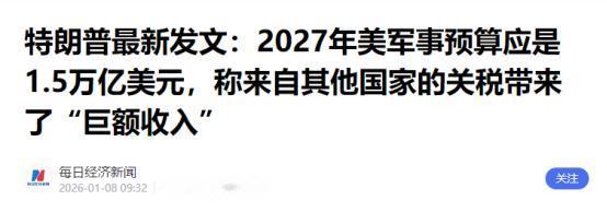 美国改口了 当地时间1月7日,特朗普公开发文表示:经过与参议员、众议员、部长和其他政治代表进行谈判。 他决定,为了国家的利益,尤其是在当前这个动荡不安、危机四伏的时期,2027年美国军事预算不应该是1万亿美元,而是1.5万亿美元。   特朗普嘴上说,这笔钱靠关税带来的巨额收入就能轻松覆盖,但事实根本不是这么回事。美国国会预算办公室早就算过账,未来11年关税能增加的收入也就2.5万亿美元,平均一年才2300亿。这点钱连新增的5000亿军费的零头都不够。   说白了,所谓的“关税支撑”就是个借口,美国宁愿背着越来越重的国债包袱,也要把钱砸在军事上,核心就是怕自己的霸权地位被撼动。   美国现在天天喊着“动荡不安”,可这世上多半的乱子,都是它自己搞出来的。俄乌冲突打了这么多年,美国又是递武器又是给援助,把欧洲直接拖进了军备竞赛的漩涡里。   2024年欧洲的军费直接涨了17%,创下了冷战后的新高。中东那边巴以冲突刚升级,美国就忙着派航母、送弹药,生怕局势降温。现在中东的军费也跟着涨了15%。   更别说美国在全球大概80个国家和地区,有将近800个军事基地。这些基地占了全球海外军事基地的85%,光是在日本就驻军5.5万人,韩国还有2.85万人。这些遍布全球的军事触角,天天在别人家门口晃悠,说白了就是靠武力维持自己制定的那些规则。   可现在这套玩法越来越不灵了。中俄等国的军事技术一直在突破,美国之前的技术代差优势越来越小。它急着把军费提到1.5万亿,就是想在高超音速导弹、导弹防御系统这些“改变游戏规则”的领域砸钱,重新拉开差距,继续用军事威慑逼着别人听话。   更关键的是,这笔天价军费背后,还有美国军工复合体的影子在作祟。雷神公司、洛克希德马丁这些军火商,早就和美国军方、政客绑在了一起,形成了盘根错节的利益集团。   之前美国2024年的预算案,就特意给军火商签了长期弹药采购合同。现在军费暴涨,受益最大的还是这些企业。特朗普之所以敢提这么离谱的预算,也离不开这些利益集团的支持。   毕竟军费越多,军火商赚得就越狠,反过来又能给政客提供更多政治资源,形成一个恶性循环。   而且对特朗普来说,提出这么个天价军费计划,还能拉拢国内的鹰派势力,讨好军方和军工集团,为自己的政治布局铺路,真是一举多得。所谓的“国家利益”,不过是个好听的幌子而已。   美国嘴里说的“危机四伏”,本质上就是它自己的霸权危机。这些年美国到处搞围堵打压,把中俄当成主要对手。它在亚太搞了个“太平洋威慑计划”,拨了91亿美元专门用来加强在太平洋的军事存在。   它还逼着北约盟友把军费提到GDP的5%以上,想形成对竞争对手的包围网。可事与愿违,你越搞对抗,别人就越要发展国防自保。2024年全球超过100个国家都增加了军费,全球军费已经连续十年增长,累计涨幅高达37%。   美国自己亲手点燃了军备竞赛的火苗,现在又觉得火势有点控制不住,只能靠再加码军费来“灭火”,最后陷入了“军费越高越不安全”的怪圈里。   大家都知道,美国现在的国债已经高得吓人,预算赤字占GDP的5.5%,早就超出了可持续的范围。把钱都砸在军事上,就意味着用来发展经济、改善民生的钱会越来越少。   可美国根本不管这些,在它眼里,军事霸权是一切的基础。只要军事实力够强,就能继续靠美元霸权收割全球财富,就能逼着其他国家接受它的规则。但历史早就证明,霸权从来不是靠堆军费堆出来的。   当年美国在伊拉克战争、阿富汗战争上花了8万亿美元,最后还不是落得个惨败的下场,浪费了无数财富和生命。现在美国还想走老路,靠1.5万亿天价军费维系霸权,其实就是在饮鸩止渴。   说白了,特朗普改口把军费提到1.5万亿,根本不是因为什么“动荡危机”。而是美国看清了自己的霸权正在松动,之前的威慑手段已经失效,只能靠砸钱来硬撑。   它想靠这支“梦想军队”继续在全球当“世界警察”,继续搞围堵打压,继续收割全球利益。但现在的世界早就不是美国一家说了算的时代了。你越搞军事扩张,越会引发更多国家的警惕和反抗。   军备竞赛只会让全球安全赤字越来越大,最后美国自己也会被拖进泥潭里。美国以为砸钱就能保住霸权,可它忘了,真正的安全从来不是靠武力威慑,而是靠平等相待、互利共赢。这条路要是一直走下去,最后只会搬起石头砸自己的脚。