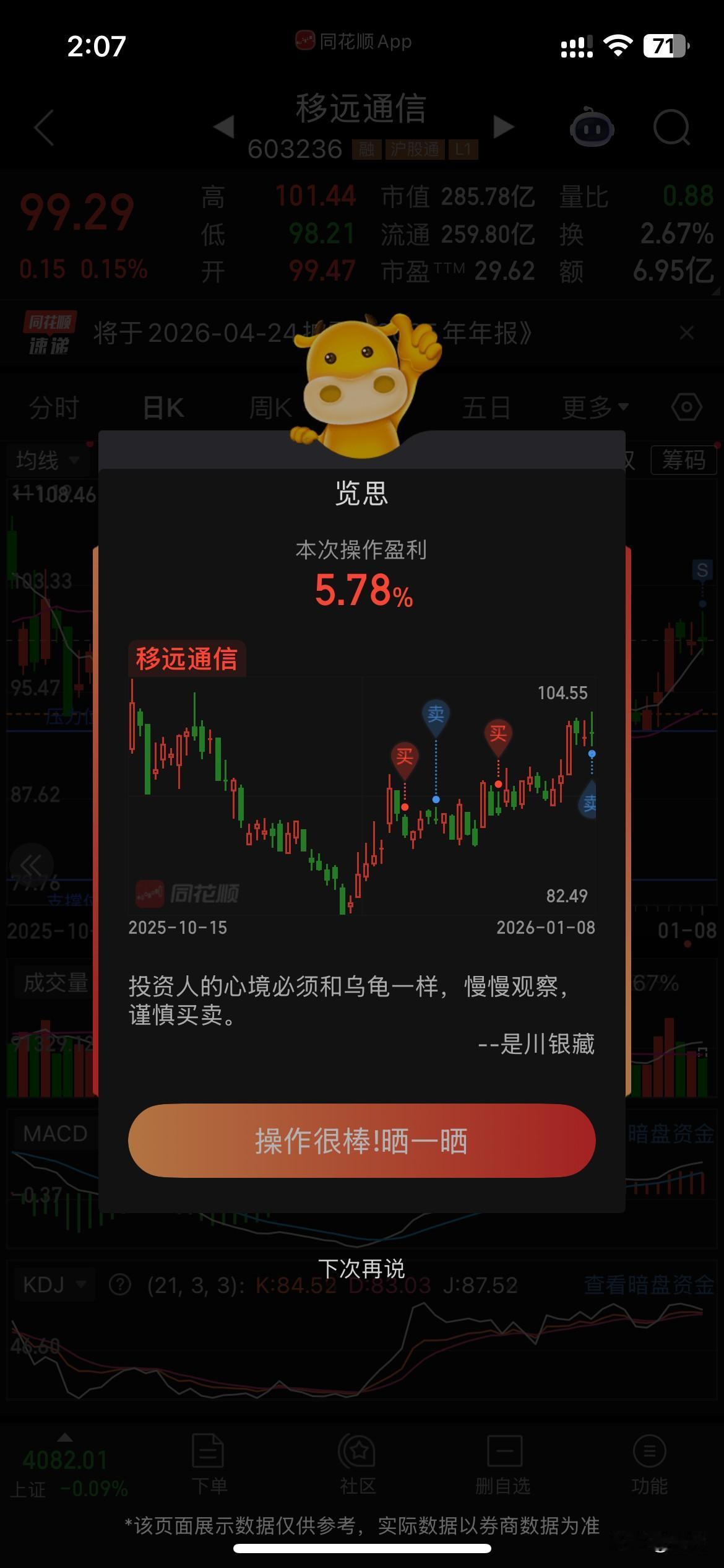 今天又绿了,大盘收出15连阳,历史罕见。我没有跟上节奏。持有的股票这月滞涨。由于大盘连续阳线,阴线随时会出现,我考虑减仓了。下午卖了移远和永兴。这两个股票是赚钱的。上午金盘冲高后回落直到尾盘。有时持股不动好像也容易错失做T的机会。今天亏7百多。