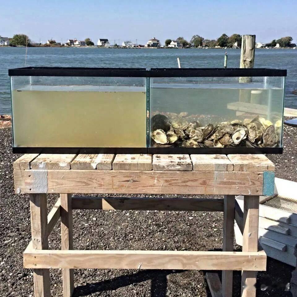 “十亿牡蛎计划”是一个总部位于纽约市的非营利组织,其目标是动员一百万人参与,到 2035 年在纽约港恢复十亿只牡蛎。由于牡蛎是滤食性动物,它们可以作为天然的水过滤器,对生态系统产生许多有益的影响。 附图展示了牡蛎水过滤的对比演示。 演示说明 左侧鱼缸: 装满了浑浊的原始海水,未进行过滤。 右侧鱼缸: 装有活牡蛎,在短时间内(通常约5小时)已将水过滤得明显清澈。 科学原理 滤食性动物: 牡蛎是滤食性动物,它们通过鳃泵水来进食。 过滤能力: 单个健康的成年牡蛎每天可以过滤多达190升(约50加仑)的水。 生态效益: 它们以水中的浮游植物、藻类、有机碎屑和多余的营养物质为食,从而去除水中的杂质和沉积物,有助于改善水质、减少富营养化并为其他海洋生物创造健康的栖息地。 这个演示强调了牡蛎在维持海洋生态系统健康方面的重要作用。