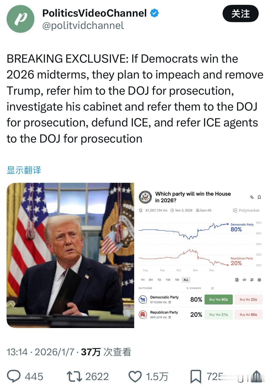 PoliticsVideoChannel账户发布了一条“独家突发消息”:如果民主党赢得2026年中期选举,他们计划弹劾并罢免特朗普,将其移交司法部起诉;调查其内阁成员并移交司法部起诉;取消ICE(移民和海关执法局)的资金,并将ICE探员移交司法部起诉。 Polymarket市场数据: 市场名称为“哪个政党将赢得2026年众议院选举?”。 截至2026年1月3日的数据显示,民主党获胜的几率为80%,而共和党的几率为20%。 该市场允许用户根据对现实世界事件的预测进行交易,从而反映实时市场情绪。 PoliticsVideoChannel(@politvidchannel)是一个在X(前Twitter)等社交媒体平台上运营的政治新闻聚合及评论账户,其发布的内容常被事实核查组织标记为具有误导性或散布虚假信息。