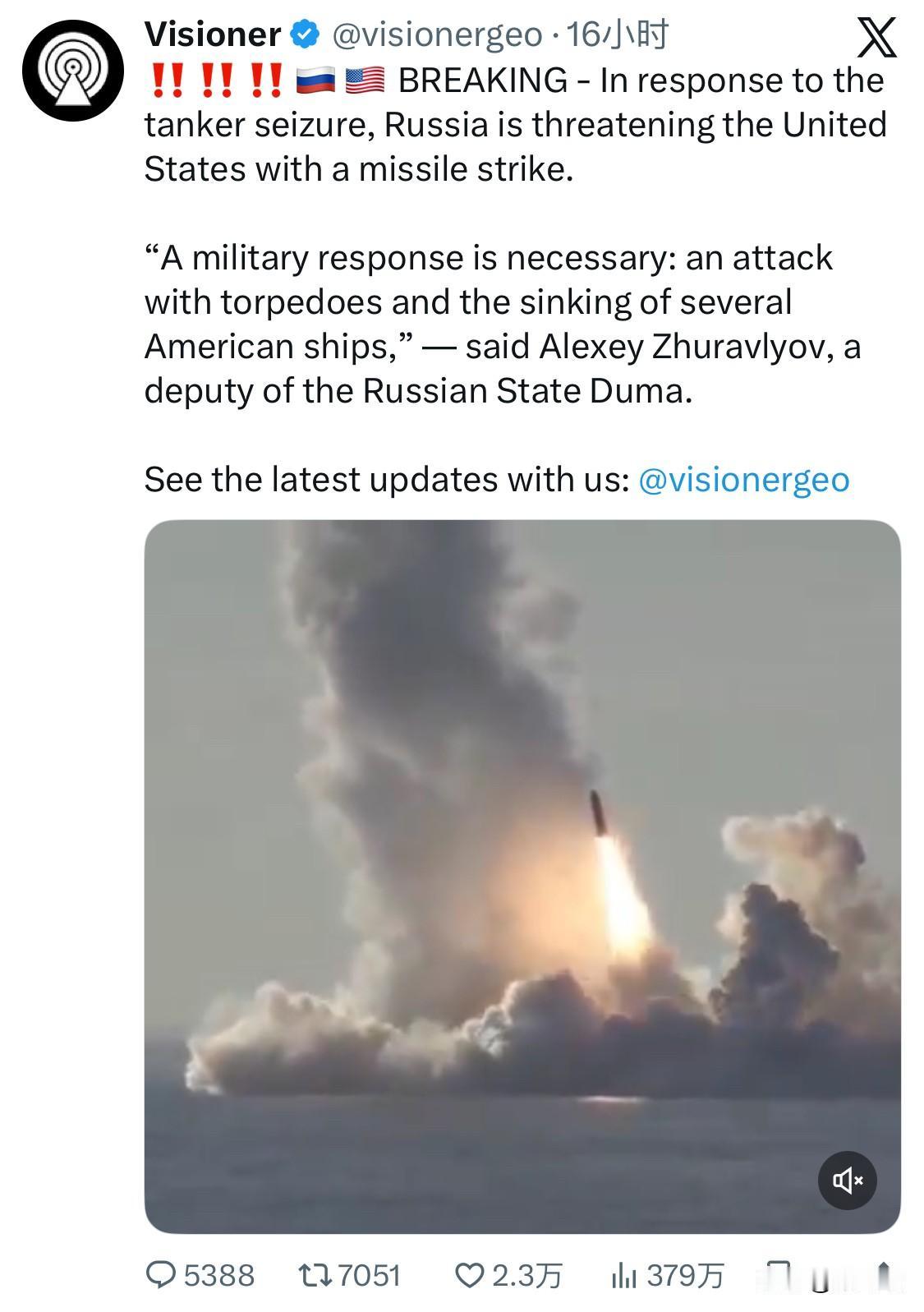 突发新闻——为回应油轮扣押事件,俄罗斯国家杜马议员、国防委员会第一副主席阿列克谢·茹拉夫廖夫(Alexey Zhuravlyov)威胁要对美国发动导弹袭击。 “必须采取军事回应:用鱼雷攻击并击沉几艘美国军舰,”阿列克谢·茹拉夫廖夫说。 2026年1月7日,美国海岸警卫队在北大西洋(靠近冰岛)扣押了悬挂俄罗斯国旗的油轮“玛丽涅拉”号(Marinera,原名 Bella 1),并扣押了加勒比海的另一艘油轮 MT Sophia。美方指控这些船只协助委内瑞拉规避制裁。 针对此事,茹拉夫廖夫在受访时表示,面对美国的“海盗行为”,俄罗斯必须做出坚决回应。他明确提出:“必须采取军事回应:用鱼雷攻击并击沉几艘美国军舰”。他还提到,根据俄罗斯的军事学说,此类攻击甚至可能引发核打击的回应。 俄罗斯外交部对此表示密切关注,谴责扣押行为违反了国际海洋法(1982年《联合国海洋法公约》),将其定性为“公然的海盗行为”,并要求美方确保俄方船员的人道待遇和安全返回。 俄罗斯安全会议副主席梅德韦杰夫也向美国政府发出警告,称“不要与俄罗斯玩游戏”。 目前,尽管议员发出了极端言论,但俄罗斯政府层面的正式回应仍侧重于法律谴责和外交压力。受此局势影响,国际黄金和白银价格在2026年1月初出现波动,军工类股票也有所上涨。